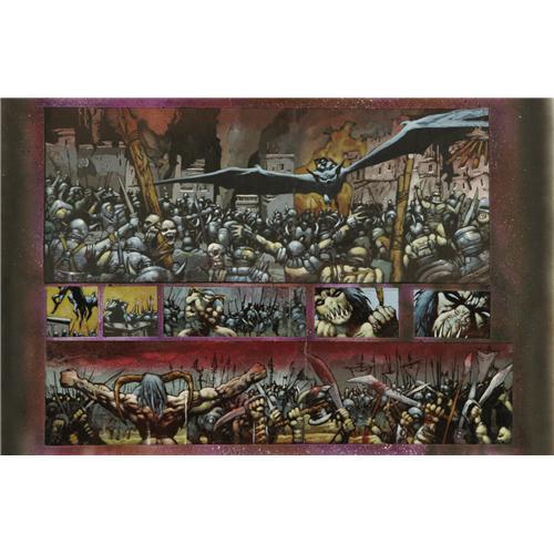 <B>Simon Bisley and Kevin Eastman - Melting Pot, Book Three, page 21 and 22 Original Art (Kitchen Sink, 1994).</B></I> Lord Tyler returns to his soldiers and rallies them to prepare to march to the Holy Land for the final battle! Simon Bisley adds his lush painted hues over Kevin Eastman's pencils. The art has an image area of 14" x 21.5" and is in Excellent condition.