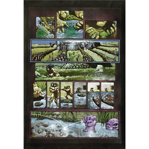 <B>Simon Bisley and Kevin Eastman - Melting Pot Book Three, page 12 Original Art (Kitchen Sink, 1994).</B></I> Lord Tyler fulfills a prophecy, as he casts a stone upon a lake, and makes his presence known to the denizens of the Council. Simon Bisley's art seizes readers and strikes them dumb with this fearsome announcement of Lord Tyler. It is as though a typhoon of art has been let loose and is sweeping all away, and a few moments are needed to recover from the page's impact, to surmount the expectation of the awful horror that has been sown. The image area of this painted page measures 12" x 17.5". Each panel has been collaged onto a support paper; otherwise the art is in Excellent condition.