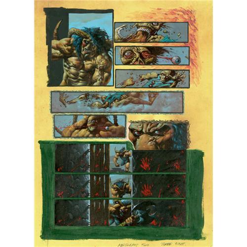 <B>Simon Bisley and Kevin Eastman - Melting Pot Book Two, page 22 Original Art (Kitchen Sink, 1994).</B></I> Simon Bisley gets down to "Biz"-ness, in this eye-popping page from his collaboration with Kevin Eastman. Each panel was painted separately and then pasted on to a 15" x 20" illustration board. Textured borders were then added around the panels. When it comes to graphic violence, Bisley spares no intimate detail! The art is in Excellent condition.
