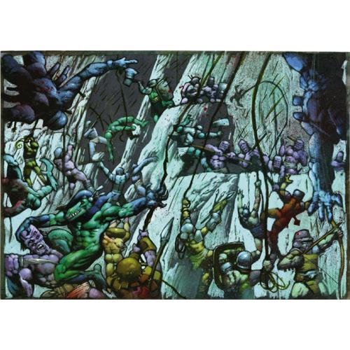 <B>Simon Bisley and Kevin Eastman - Melting Pot Original Art (Kitchen Sink, 1994).</B></I> A virtual masterpiece of mutated futuristic battlefield violence. The cool, shadowy color palette contrasts with the red-hot combat of this action-packed full-page battle scene. The artwork measures 13.75" x 9.75" and is in Excellent condition.