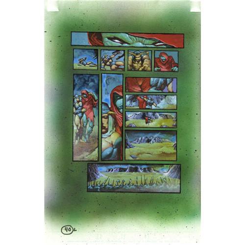 <B>Simon Bisley and Kevin Eastman - Melting Pot, page 40 Original Art (Kitchen Sink, 1994).</B></I> A hooded figure helps the wounded Zarharr walk in this very colorful page. Simon Bisley expertly brushes the paint over Kevin Eastman's pencils. This page measures 11" x 17" and the art is in Excellent condition.