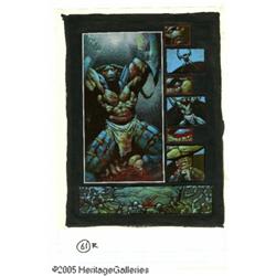 <B>Simon Bisley and Kevin Eastman - Melting Pot, page 61 Original Art (Kitchen Sink, 1994).</B></I> Lord Tyler raises his arms in apparent victory, but then his blood begins to flow... Lord Tyler's wounds drip thickly, inundating his torso with blood that stains his body like congealing mulberry juice. The image area measures 9" x 12.5". Each panel has been collaged onto a support paper; otherwise the art is in Excellent condition. The Biz's painting technique is layered to produce a rich, full-bodied painted surface.