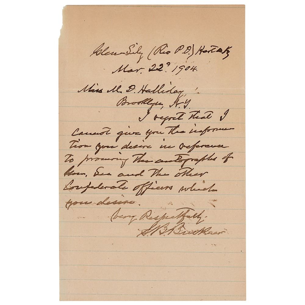 Confederate general (1823-1914) best remembered for submitting to Grant's famous demand for unconditional surrender at the Battle of Fort Donelson. ALS signed "S. B. Buckner," one page, 5 x 8, March 22, 1904. Handwritten letter to Miss M. D. Halliday, in full: "I regret that I cannot give the information you desire in reference to promising the autographs of Gen. Lee and the other Confederate officers which you desire." In fine condition.