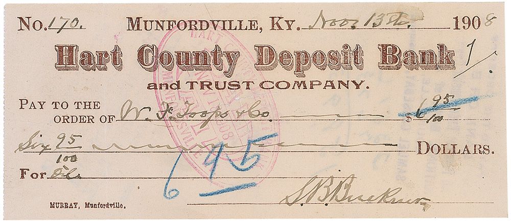 Confederate general (1823–1914) best remembered for submitting to Grant’s famous demand for unconditional surrender at the Battle of Fort Donelson. After the war, Buckner served as Governor of Kentucky, and, in 1896, as the unsuccessful vice-presidential candidate on the ‘Gold Democrats’ ticket. Bank check, 6 x 2.5, filled out and signed by Buckner, payable to W. F. Toops & Co. for $6.95, November 13, 1908. In fine condition, with trivial vertical folds, blue pencil bank notations to the front, a central cancellation cut, and a couple mild brushes to the ink, none affecting the signature.