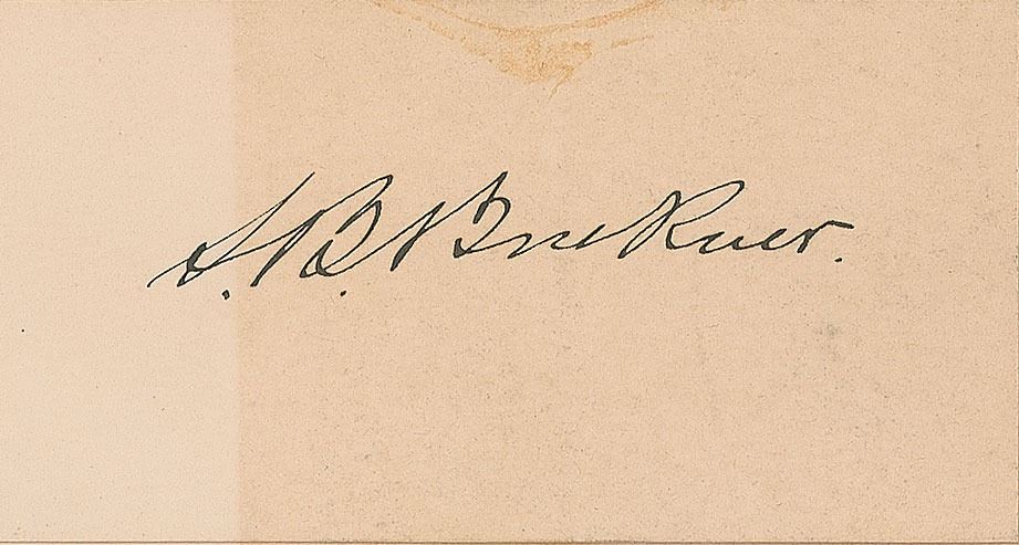 American soldier and politician (1823–1914) who fought in the United States Army in the Mexican–American War and in the Confederate States Army during the American Civil War. He later served as the 30th governor of Kentucky. Ink signature, "S. B. Buckner,” on an off-white 3.5 x 1.75 card affixed to a slightly larger sheet with pencil notations dating the signature to September 8, 1887. In fine condition, with light toning over most of the card, and a small glue stain to the top edge.