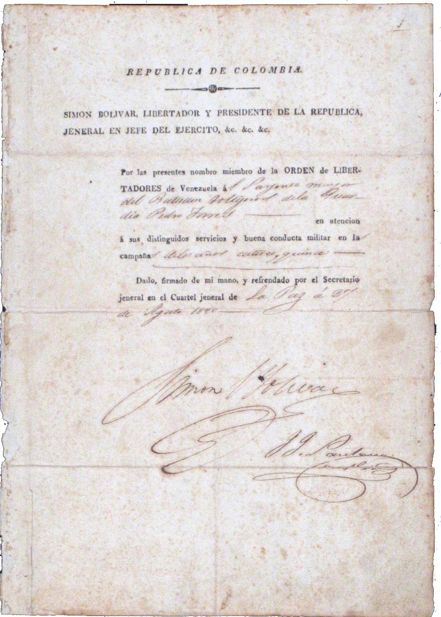 Rare military appointment signed by South American revolutionary leader Simon Bolivar. Spanish-language official Republica De Colombia manuscript dated 27 August 1825 is signed large and bold to lower portion. Known as the ''George Washington of South America,'' Simon Bolivar defeated the Spanish in 1819 and helped to liberate Peru and Bolivia. Document measures 8.25'' x 13''. Very good condition.