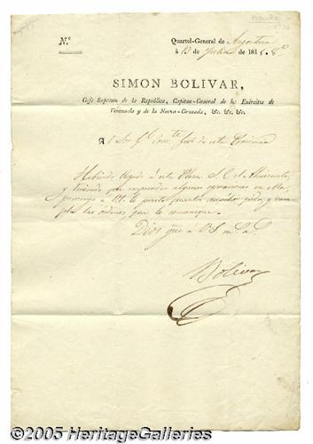 <B>Simon Bolivar Signs a Beautiful Military Document</B></I> The national hero of Venezuela, Colombia, Ecuador, Peru and Bolivia, born in Caracas. Having travelled in Europe, Simon Bolivar (1783-1830) played the most prominent part in the wars of independence in South America. In 1819, he proclaimed and became President of the vast Republic of Colombia (modern Colombia, Venezuela, and Ecuador), which was finally liberated in 1822. He then took charge of the last campaigns of independence in Peru (1824). In 1826, he faced growing political dissension. He resigned office in 1830, and died on his way into exile. Document signed, 1 page, 8.5" x 12", July 10, 1818. The document is in Spanish, and reads, "Simon Bolivar, Supreme Chief of the Republic, Captain-General of the Army of Venezuela and of the New-Granada, Etc., Etc., Etc. To the Sir General Executive Committee of this Province Since the SE Admiral arrived to this Plaza and has to execute some operations on it, I want you to be prepared to give him as much as illegible he asks, and to obey the instructions that he communicates to you. God that to You illegible (signed) Bolivar". <I>Accompanied by COA from PSA/DNA.</B></I>