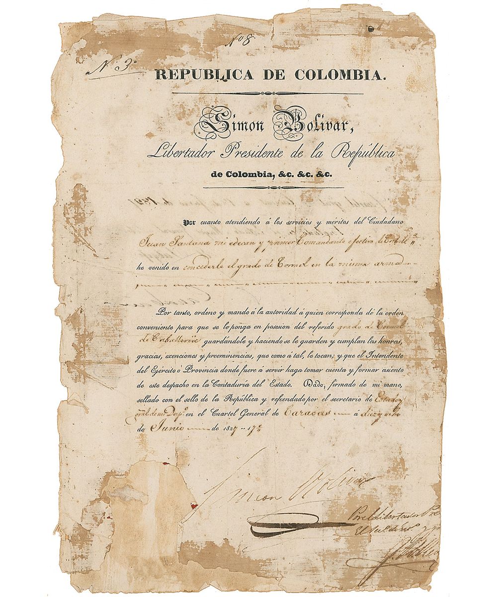 Revolutionary and political leader (1783–1830) whose military campaigns against the Spanish were instrumental in the emergence of the independent nations of modern South America, including Bolivia, which was named in his honor. Partly-printed DS, in Spanish, one page, 8.5 x 12.5, June 14, 1827. Untranslated official government document signed by Bolivar as president of Columbia. Document is affixed to a slightly larger off-white sheet, and in turn affixed to another slightly larger sheet. In good condition, with moderate toning and soiling, paper loss to edges, more prevalent at bottom, intersecting folds and creases, one through a single letter of signature, and signature fairly light, but still legible.