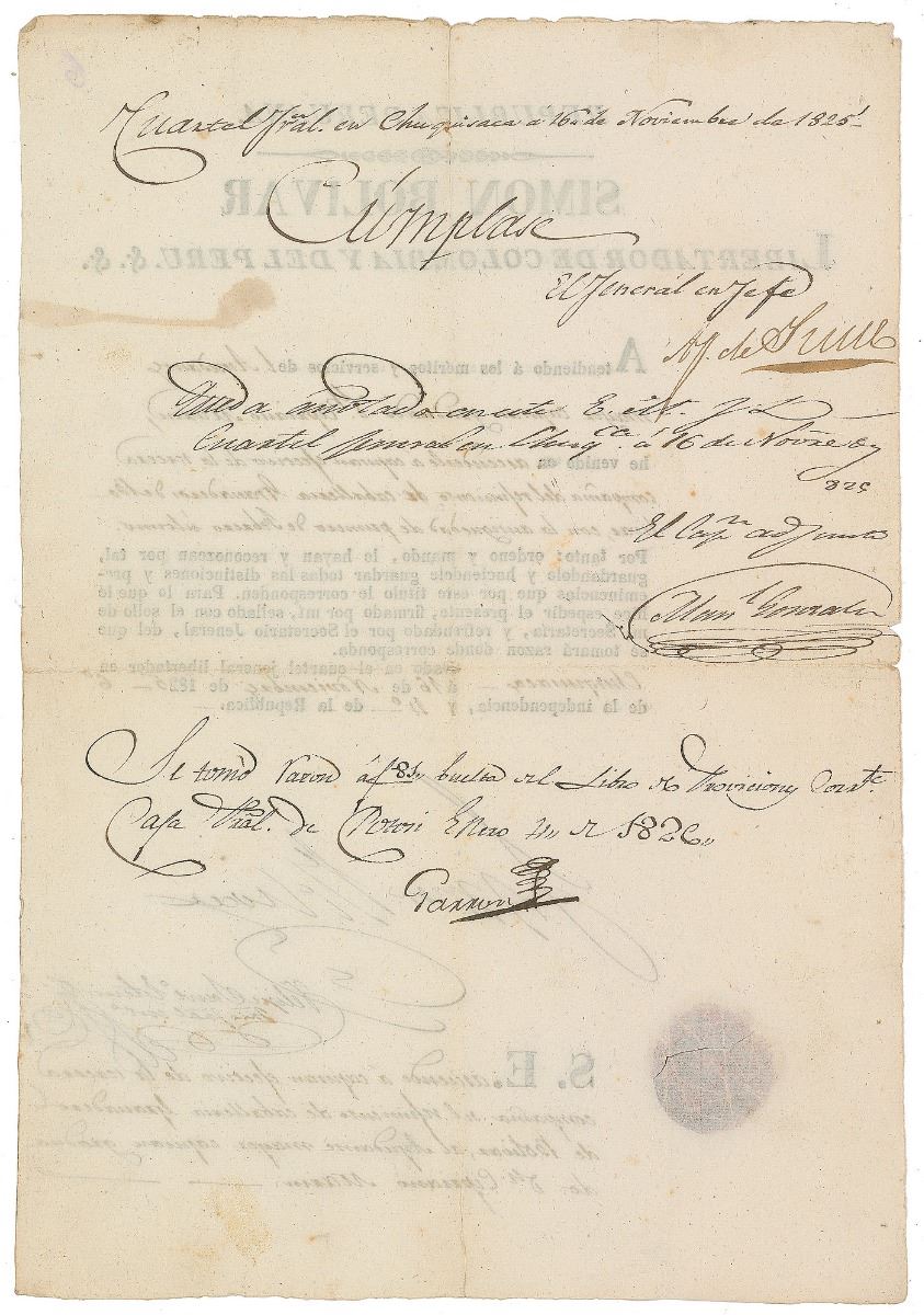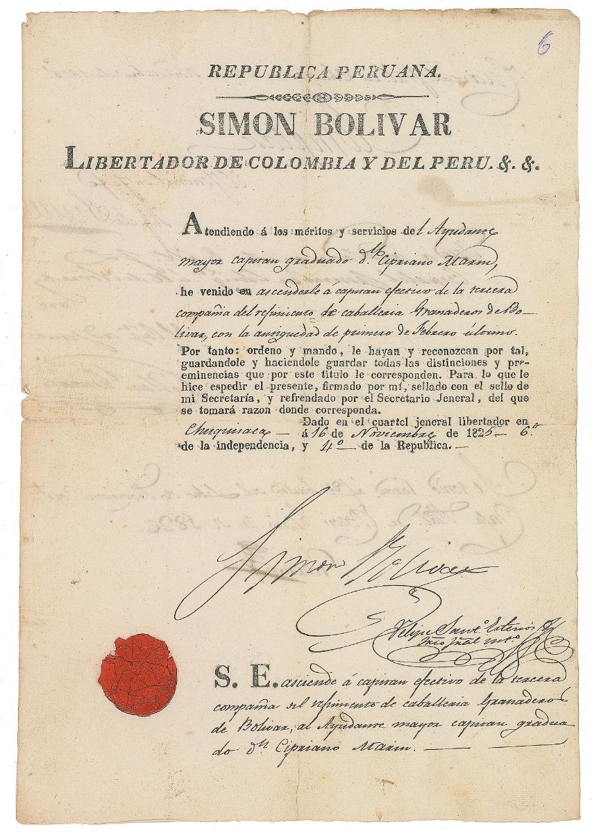 Scarce partly-printed DS in Spanish, one page, 8.5 x 12.25, November 16, 1825. As president of Peru, Bolivar appoints a captain to active service in the Peruvian army. Signed at the conclusion by Bolivar, and endorsed on the reverse by others including Antonio Jose de Sucre, who succeeded Bolivar as president. In fine condition, with scattered light soiling.