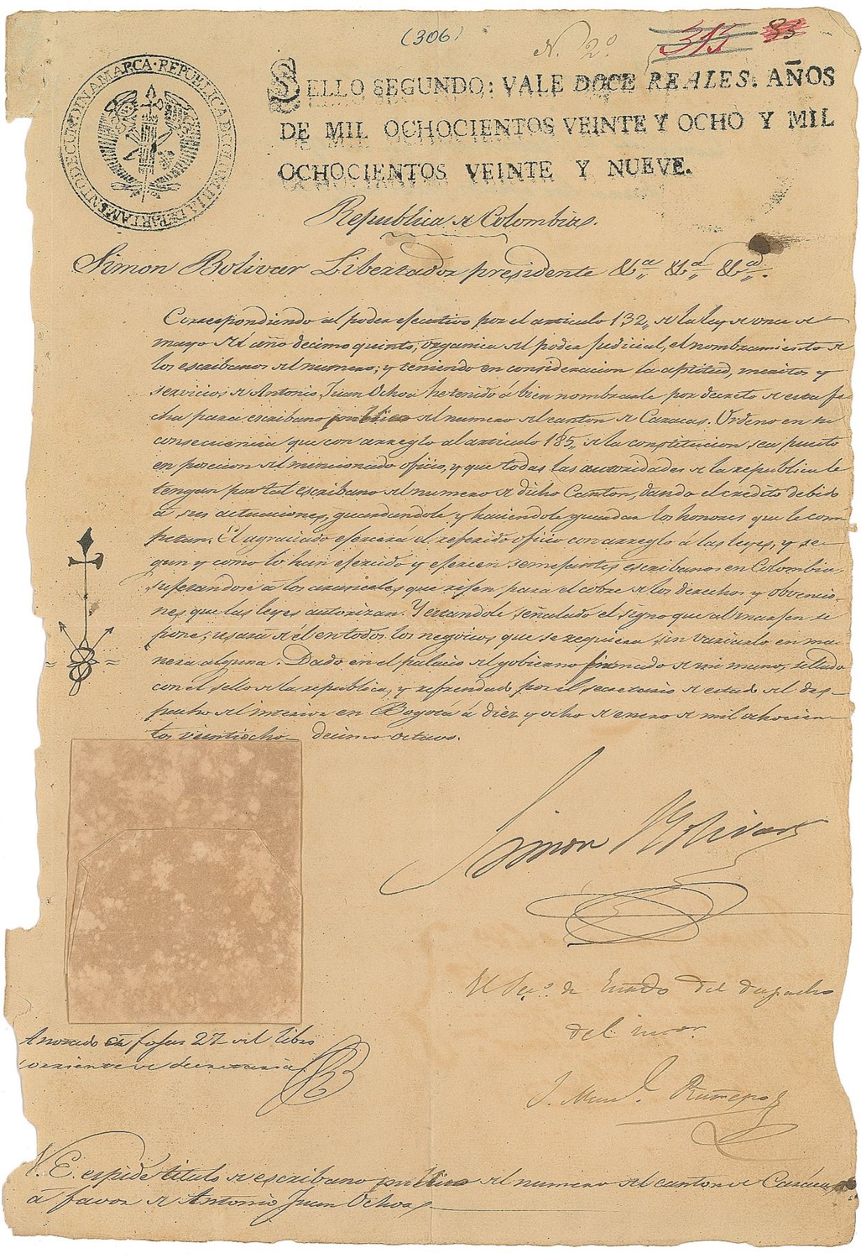 Revolutionary and political leader (1783–1830) whose military campaigns against the Spanish were instrumental in the emergence of the independent nations of modern South America, including Bolivia, which was named in his honor. Manuscript DS in Spanish, one page, 8.5 x 12.25, January 18, 1828. Bolivar appoints Antonio Juan Ochoa as (translated) "a public notary with a regular position in the canton of Caracas." Prominently signed at the conclusion by Bolivar as president of Colombia, and countersigned by Minister of the Interior J. Manuel Restrepo. The folded seal affixed to the lower left remains intact. In very good to fine condition, with areas of paper loss along edges. Accompanied by a full translation.