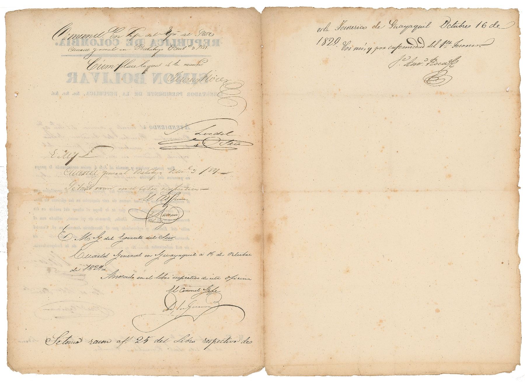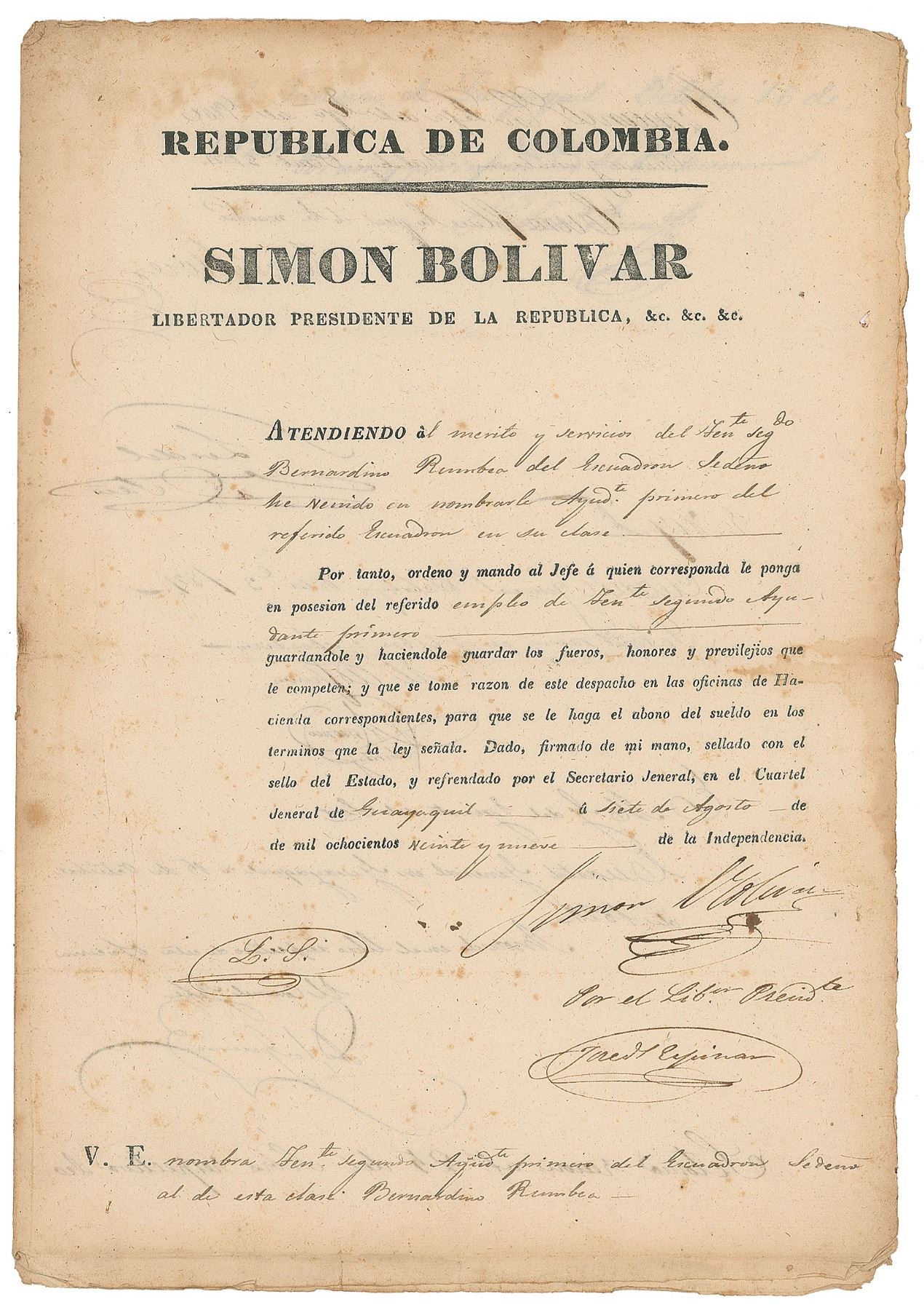 Partly-printed DS in Spanish, three pages on two adjoining sheets, 8.5 x 12.25, August 7, 1829. As president of Colombia, Bolivar recognizes the merits and services of 2nd Lt. Bernardino Rumbeo of the Sedeña Squadron, and names him as 1st Adjutant of the Squadron. Signed at the conclusion by Bolivar and endorsed by several other officials. In very good to fine condition, with scattered light foxing, and some light staining along the edges.