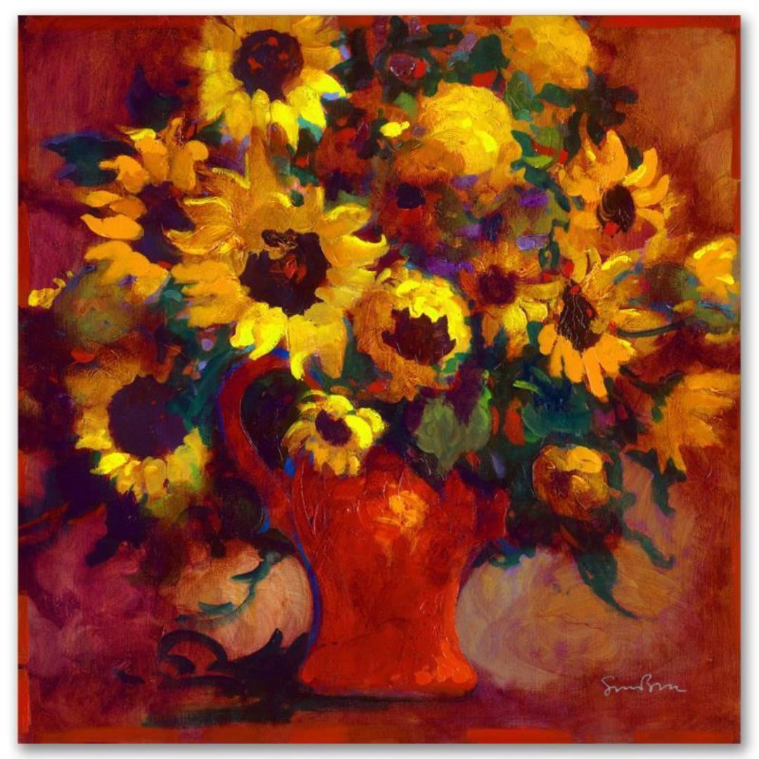 "Sunflowers" is a numbered limited edition giclee on canvas by Simon Bull bearing the artist's authorized signature. This piece comes gallery wrapped and includes a Letter of Authenticity. Measures approx. 20" x 20" x 1.5" (image). This item requires special handling and may have a longer than usual turnaround.