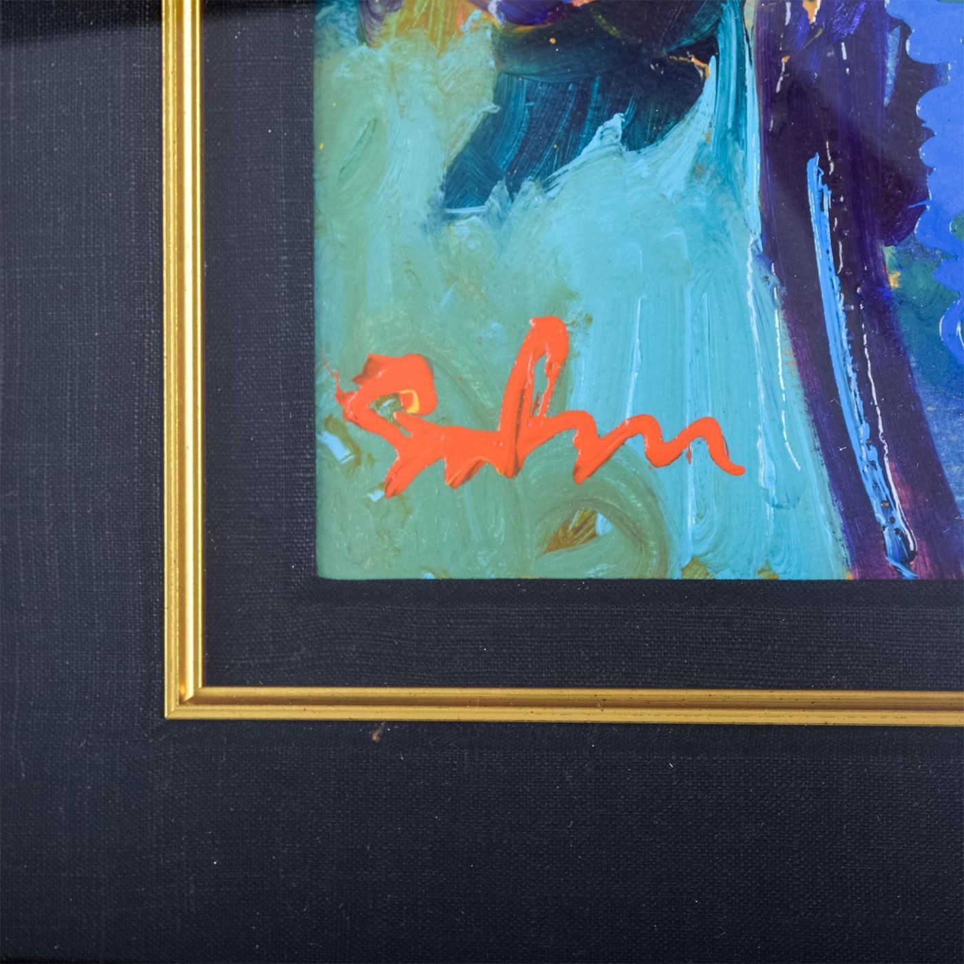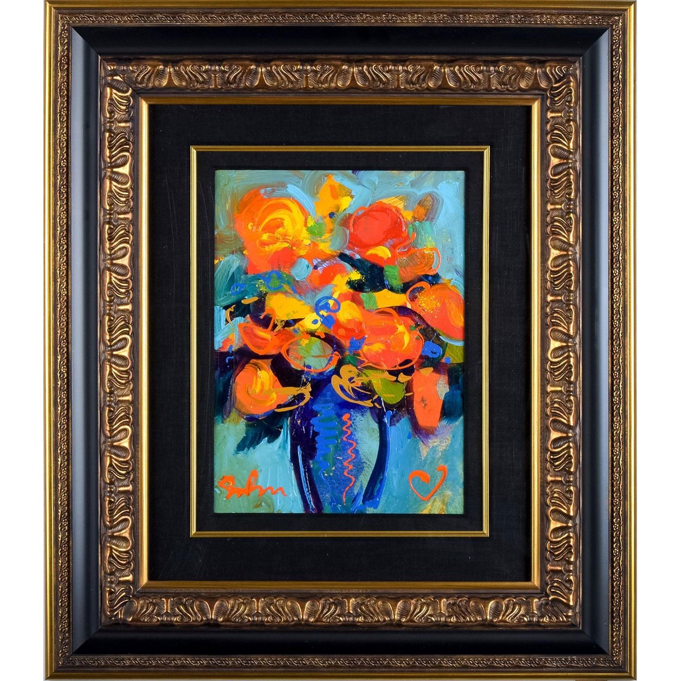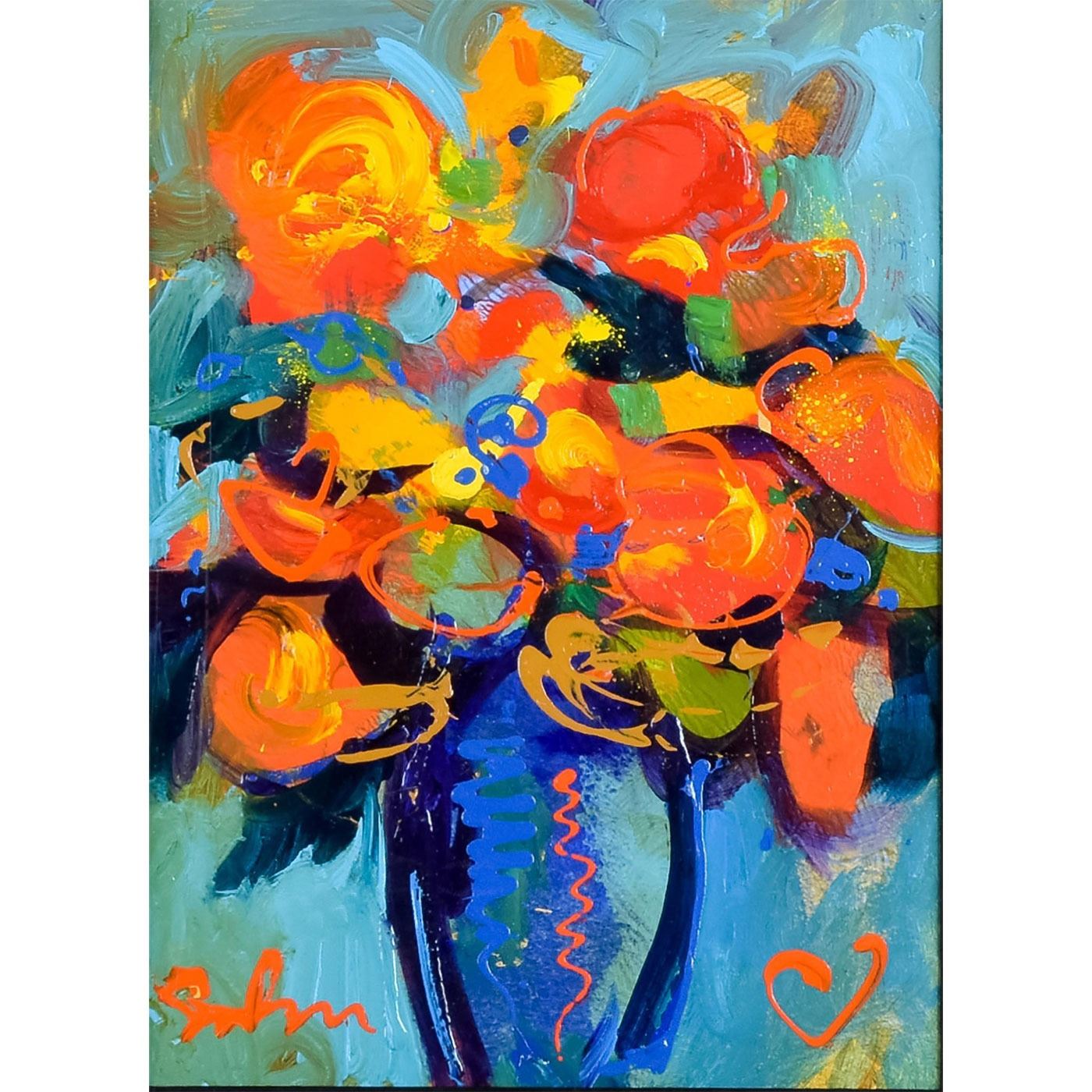 Features a flower pot. Abstract brushstrokes with striking combinations of blue, orange, yellow, and red. Artist signature lower left, acrylic. Housed in ornate bronze frame with black matte. Good condition. Sight size: 14.5"H x 10.5"W. Frame size: 29"H x 25"W. #art #painting #acrylicpainting #simonbull