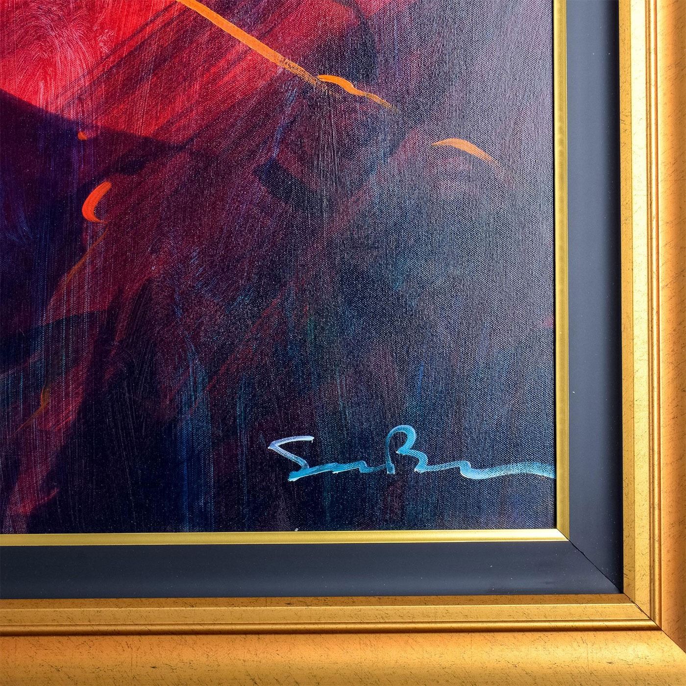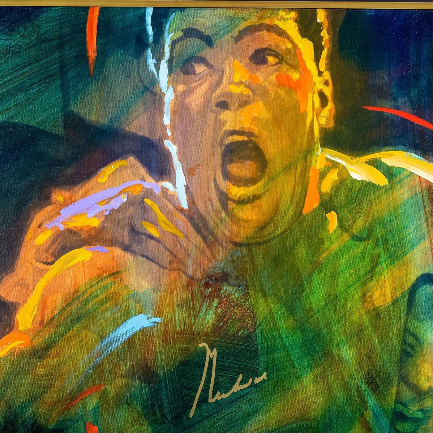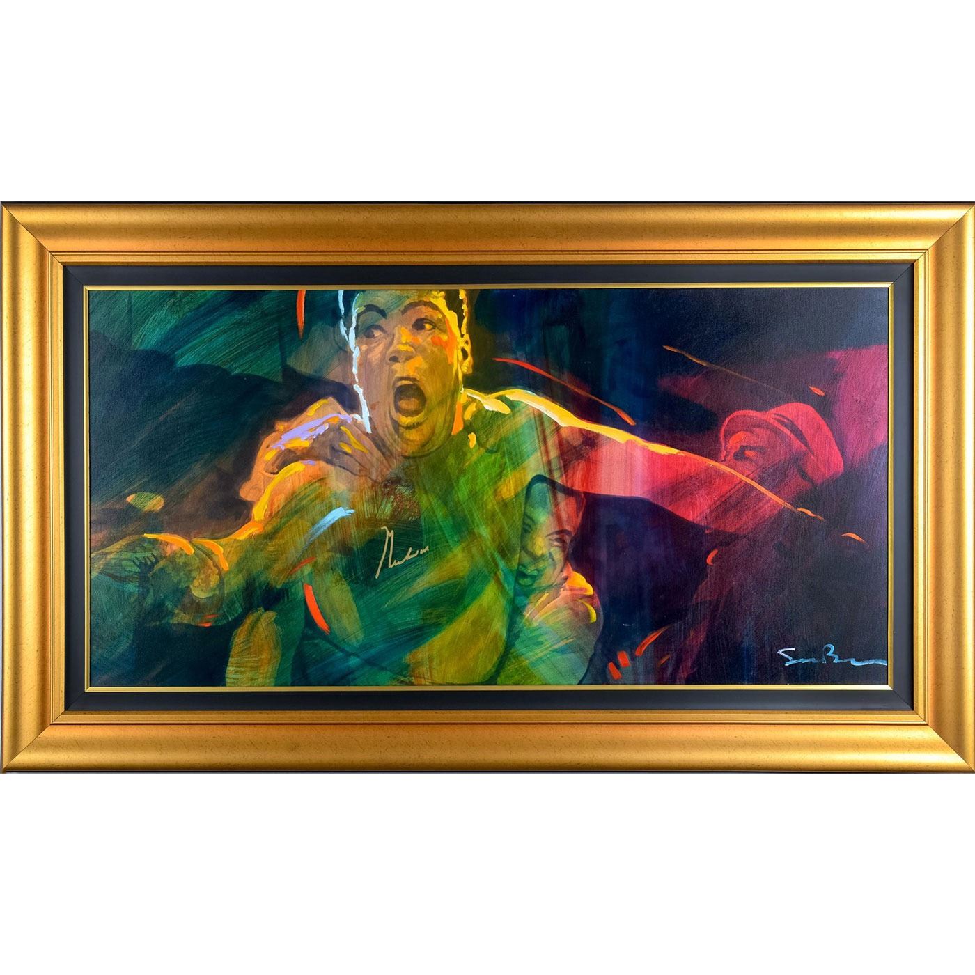 Hand-signed by Muhammad Ali and Simon Bull. Original painting is inspired by famous moments, image and the athletic history of Muhammad Ali. Housed in matte black and gold frame. Comes with "Certificate of Authenticity" by Park West Gallery. This work is one of a series of painting with a giclee on canvas which is then hand-painted by Simon Bull utilizing different colors and techniques. It is titled by the artist and includes the number from the series on the verso. In 2009, this series was added to the collection of "The Muhammad Ali Center" in Louisville, Kentucky. Great condition. Sight size - 24"H x 48"W. Frame size - 33.75"H x 57.5"W. #MuhammadAli #SimonBull #Boxing