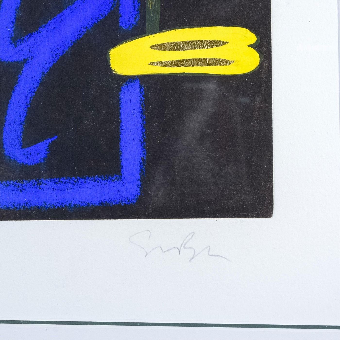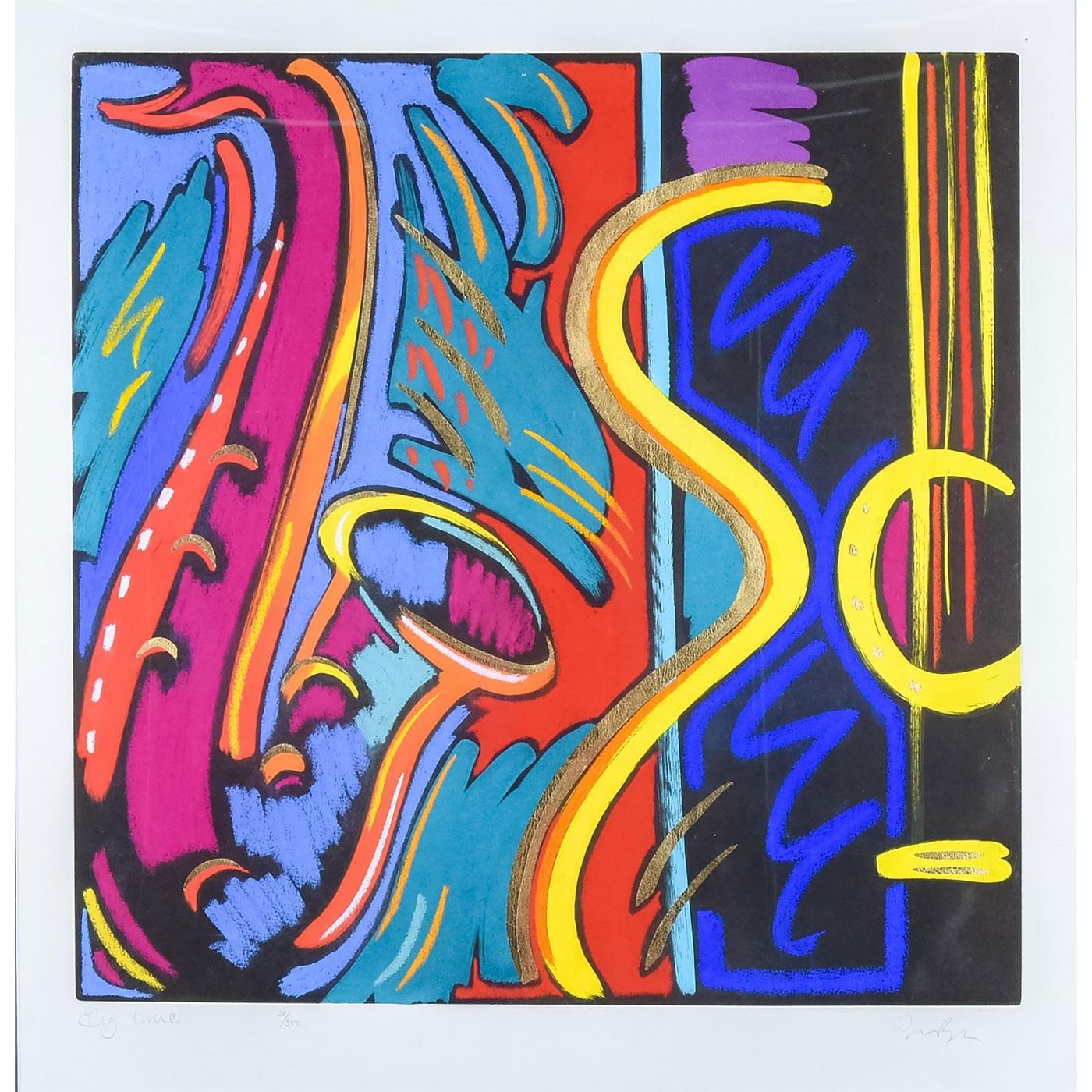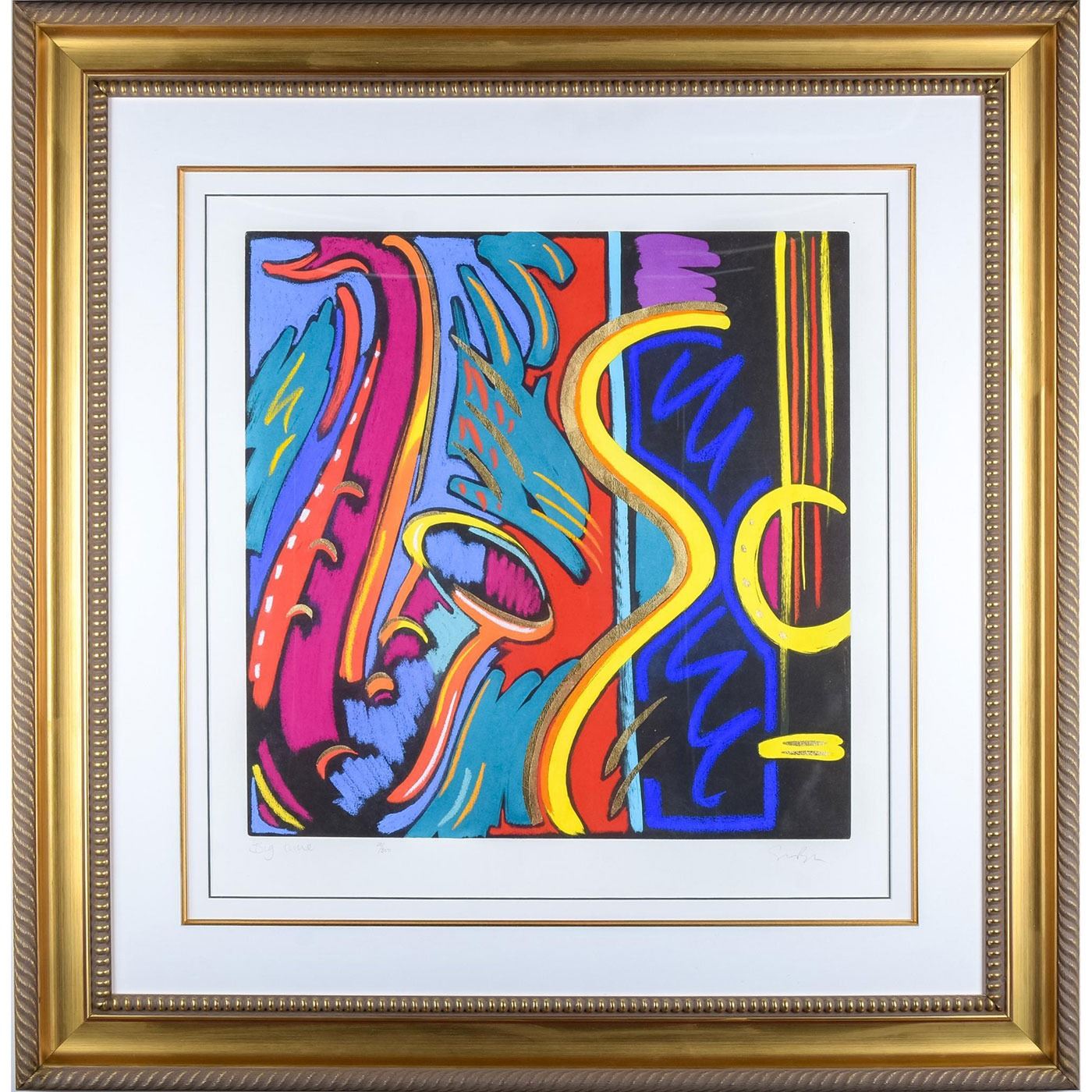 Limited edition print 28 of 350. Housed in ornate gold frame. Hand-signed in pencil by artist on lower right corner. Strong brushstroke abstract style painting of saxophone and guitar in vibrant colors with gold accent. Hand-signed title and print number in pencil on lower left corner. Great condition. Sight size - 27"H x 27.5"W. Frame size - 41.75"H x 40.5"W. #Mixedmedia #abstract #jazz