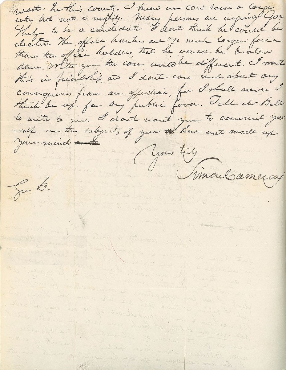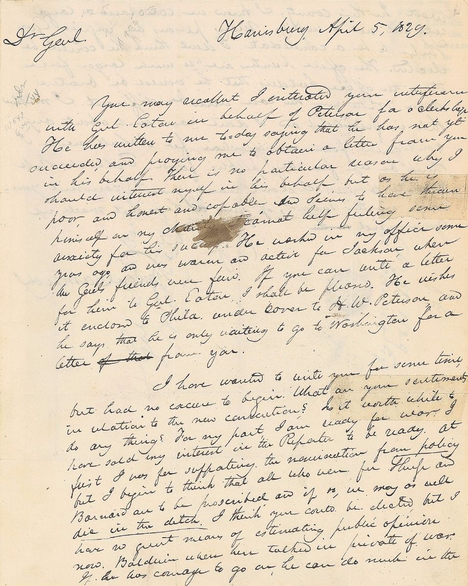 Lincoln’s controversial first secretary of war (1799–1889). ALS, one page both sides, 8 x 10, April 5, 1829. Letter to J. D. Barnam concerning a letter of recommendation, in part: ”He has written to me to–day saying that he has not yet succeeded and praying me to obtain a letter from you on his behalf. There is no particular reason why I should interest myself in his behalf but as he is poor and honest and capable…I cannot help feeling some anxiety for his success. He worked in my office some years ago and was warm and active for Jackson when…friends were few.” Affixed to a slightly larger presentation sheet. Addressed on the second integral page in his own hand. In very good to fine condition, with tape repairs to horizontal folds, and a strip of tape along separated hinge.