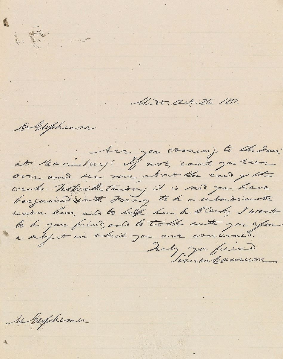 Lincoln’s controversial first secretary of war (1799–1889). ALS, one page, lightly-lined, 7.75 x 9.75, October 26, 1857. In part: “Are you coming to…the Harrisburgs? If not, can’t you…see me about the end of the week? Notwithstanding it is said you have bargained with Ferry to be a subordinate under him, and to help him Clerk.” In very good to fine condition.