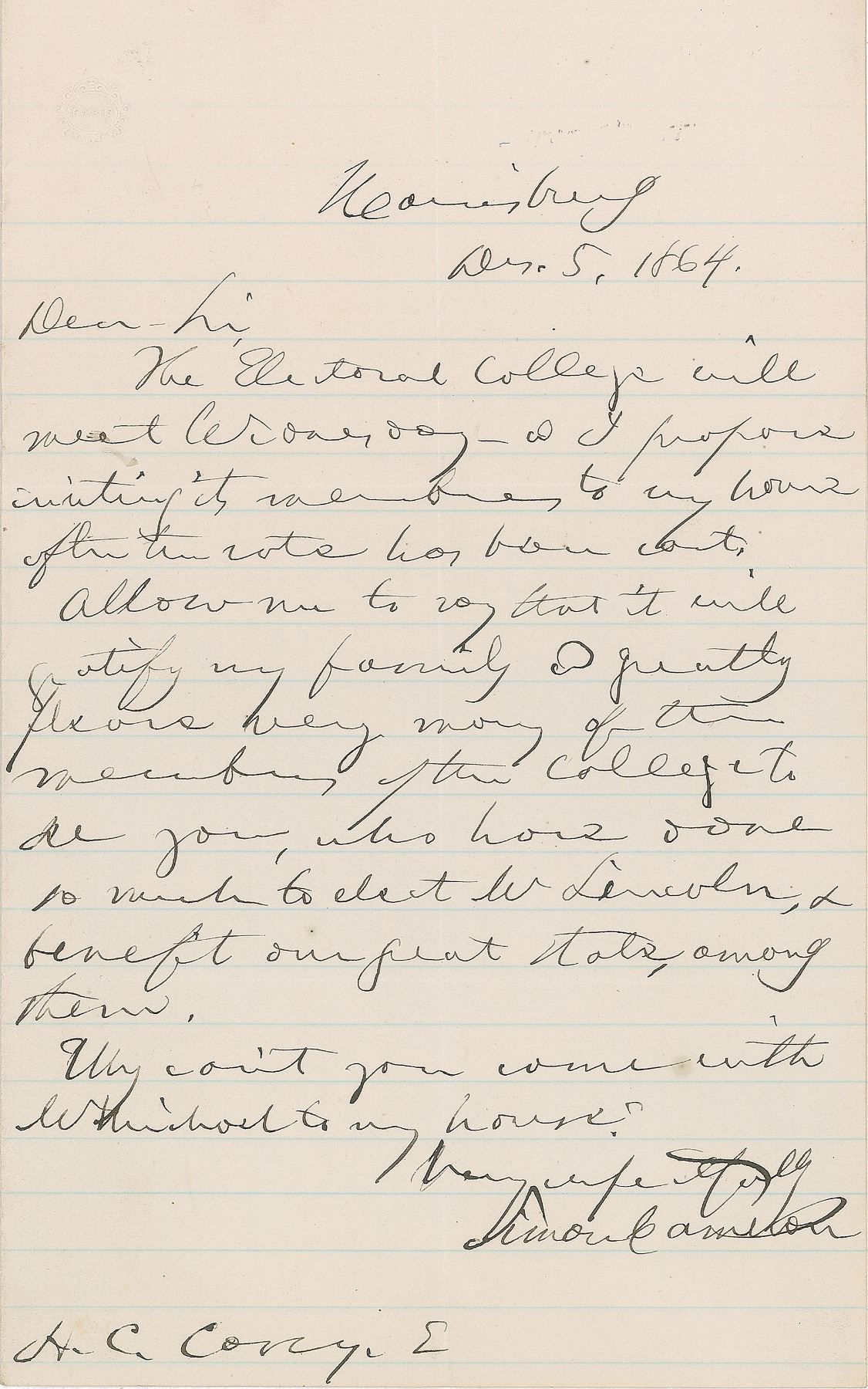 Lincoln's controversial first secretary of war (1799–1889), who served only one year before resigning amidst allegations of corruption. ALS, one page, 5 x 8, December 5, 1864. In part: "The Electoral College will meet Wednesday…I propose writing its members to my house after the vote has been cast. Allow me to say that it will gratify my family and greatly please very many of the members of the College to see you, who have done so much to elect Mr. Lincoln, & benefit our great State, among them." In fine condition.