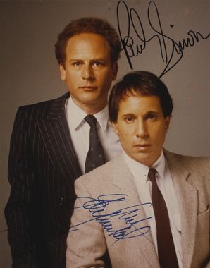 A framed colour photograph of Paul Simon and Art Garfunkel with clear autographs in marker.