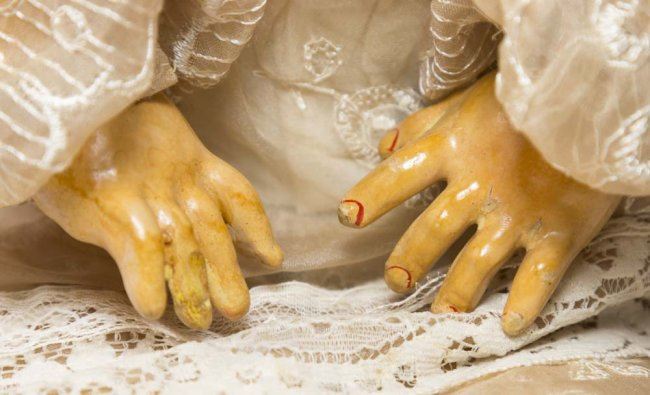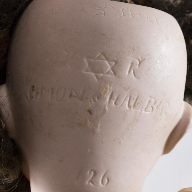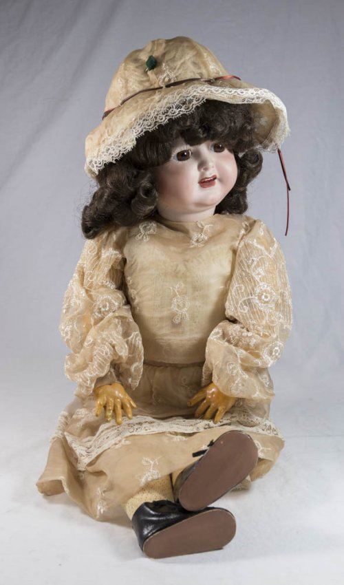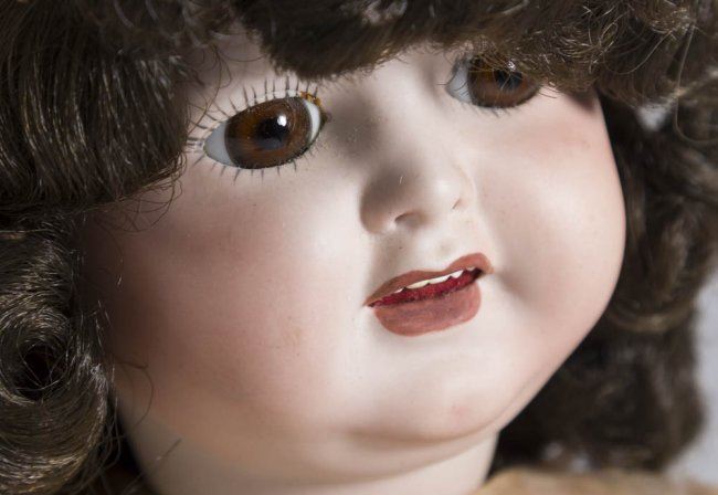 Bisque head with brown glass eyes. Composition body and limbs. With brown curled wig. Hands are yellowed. Good condition.