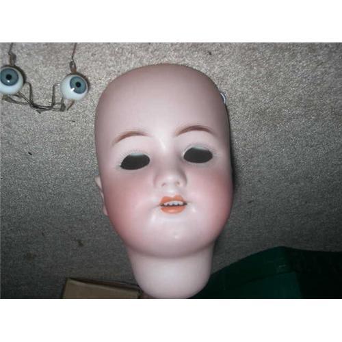 Here is a German bisque socket doll head made by Simon and Halbig. It is 6 1/2" tall from the socket base to the rim of the forehead. She has an open mouth with 4 teeth. The head is marked 550 Simon & Halbig S& H