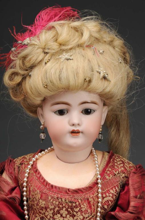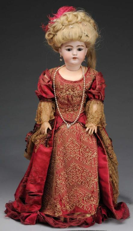 Description Incised "S&H1079-12" with brown glass sleep eyes, open mouth with upper teeth, original body with patina, and elaborately dressed in a costume representing a lady of the court in the early 1800s. Considerable melting to costume. Condition (Very Good). Size 25" T.