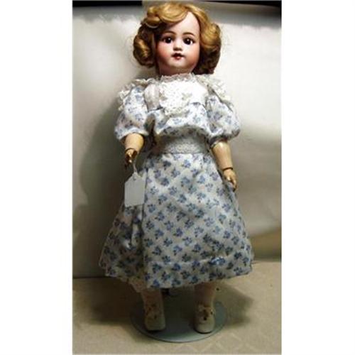 This little lass has had over a hundred years of experience in being a charmer and her abilities have not been diminished by the years. Made by the German dollmakers Simon & Halbig in the 1890's, she is model #540. Her head which swivels, is porcelian with a delicately blushing complexion, gracing a classicly Victorian face. Painted eyelashes and eyebrows frame her striking brown eyes. We had to have her eyes professionally replaced. Someone along the way has given her a new head of hair. If the curls were unpinned, they would no doubt be sausage style. We have decided to leave them pinned and let her new owner make the choice to pin or not to pin. The body is composition with ball & socket joints. Reasonable aging is seen in the photos. However, there are no chunks gone. The clothes, though not original, are appropriate. She is wearing a blue flowered dress, a eyelet slip, knee stockings and white kid shoes. I had one doll dealer tell me that she believes this doll could possibly be a married piece. She thinks the body is one size smaller that the head. I am NOT a doll expert, so I will just pass that information along as an opinion. I have reduced the price of this doll because a customer took her out of her stand and made a scratch on her cheek trying to put her back, all reasonable offers will be considered and additional photos are available upon request. One final note--the sale of this doll will benefit our local Hospice. They are one of our dealers here in ...
