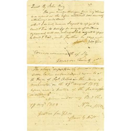 <B>Simon Kenton Signed Deposition</B></I> Interesting content involving a colorful Revolutionary War figure, 2 pages, 7.75” x 12.75”, Washington, Mason County, Kentucky, August 29, 1823. Virginia native Simon Kenton (1755-1836) was a frontiersman and good friend of the legendary Daniel Boone. In 1771, at age 16, he nearly beat a man to death for the hand of a local lass. Thinking he had killed him, Kenton, using the alias “Simon Butler,” fled into the Kentucky wilderness, eventually serving as a scout and soldier in the Revolutionary War, the Ohio Indian Wars (1793-94), under the command of “Mad” Anthony Wayne, and the War of 1812. Since Kenton was illiterate, this 1823 deposition was taken from him at a tavern in Washington, Kentucky, to be used as evidence in a suit over a land contract signed in 1780. The second page includes the scrawled but legible signature <I>“Simon Kenton” </B></I>(the “t” in Kenton has been added in another hand). His signature is followed by an addition written by the witness, James Arthur, owner of the tavern. The document is now in two pieces of equal size, cleanly torn in half along the original center horizontal fold. The two-page text (front and verso) is half of a larger sheet that was folded over to provide an envelope, which includes the address <I>“Clerk of Mason County Court”</B></I>. Aside from the tear, the document is in fair-good condition with some staining and a small hole left from the original wax seal.<BR><BR><b>Shipping:</b> Flat Material, Small (<a target="_blank" href="http://www.heritageauctions.com/common/shipping.php">view shipping information</a>)