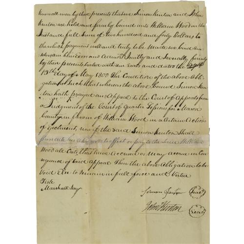 <B>Wonderful Simon Kenton Document Signed Regarding Debt to William Wood.</B></I> One page split, measures 8" x 13", dated May 13, 1800. Darkly signed by both Simon and John Kenton. Docketed on the verso, general toning; old tape repairs holding together fold entirely separated with small paper loss affecting few words of text; occasional minor chipping, otherwise in good condition. <BR><BR>Simon Kenton, American frontiersman. In 1771, believing he had killed a man, he fled westward, assuming the name Simon Butler. He settled in Boonesboro, Kentucky, in 1775 and defended the settlement against frequent Native American attacks; in one of these encounters he saved Daniel Boone's life. During the American Revolution he accompanied (1778) George Rogers Clark on his expedition to Kaskaskia and Vincennes and helped Boone in the raid on Chillicothe. He was later captured by the Native Americans, who brought him to the British in Detroit, but he escaped (1779) and again joined Clark as a scout. Learning that the man he thought he had killed was alive, he resumed his original name, and eventually settled (1799) in Ohio. Kenton was elected a brigadier general of militia in 1804 and served in the War of 1812 at the battle of the Thames. <BR><BR>The document reads in full, "Know all men by these presents that we Simon Kenton and John Kenton are held and firmly bound unto William Wood, in the Instance full sum of two hundred and forty dollars to the which payment will and truly be made we bind ourselves and heirs Exors and Admons douilly [sic] and Severally firmly by these presents sealed without seals and dated the 13th day of May 1800. the condition of the above obligations such that whereas the above bound Simon Kenton hath prayed an appeal to the Court of Appeals from a Judgment of the Court of Quarter Sessions for Mason County in favour of William Wood in a Certain Action of Ejecuturant, now if the said Simon Kenton shall prosecute his appeal to effect or pay to the said William Woodale costs and damage that have accrued oj may accrue in the consequence of said appeal, there the above obligation to be void else to remain in foil force and virtue."