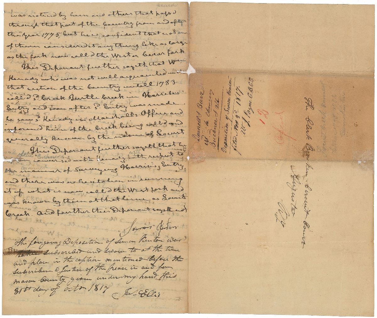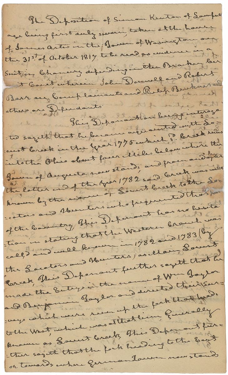 Famous frontiersman and soldier (1755–1836) who was a friend of Daniel Boone and served in the American Revolution, Northwest Indian War, and War of 1812. Manuscript DS, one page both sides, 7.5 x 12.5, October 31, 1817. Legal deposition regarding property. In part: “This Deponent on being interrogated sayeth that he became acquainted with Locust Creek in the year 1775 which s’d Creek was into the Ohio about four Miles below where the Town of Augusta now stands, and from and after the latter end of the year 1782 said Creek was well known by the name of Locust Creek to the Locators and Hunters who frequented that part of the country.” Signed at the conclusion by Kenton and countersigned by a witness. In very good condition.