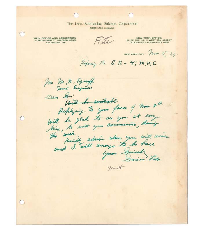 SIMON LAKE (1866-1945). American mechanical engineer and naval architect who competed to build the first submarine for the United States Navy. Autograph Letter Signed, “Simon Lake,” on The Lake Submarine Salvage Corporation letterhead. One page, 8 1/2” x 11”. New York City. November 5, 1935. Lake writes to arrange a meeting with one M.N. Egeroff[?], a senior engineer. Very Fine.