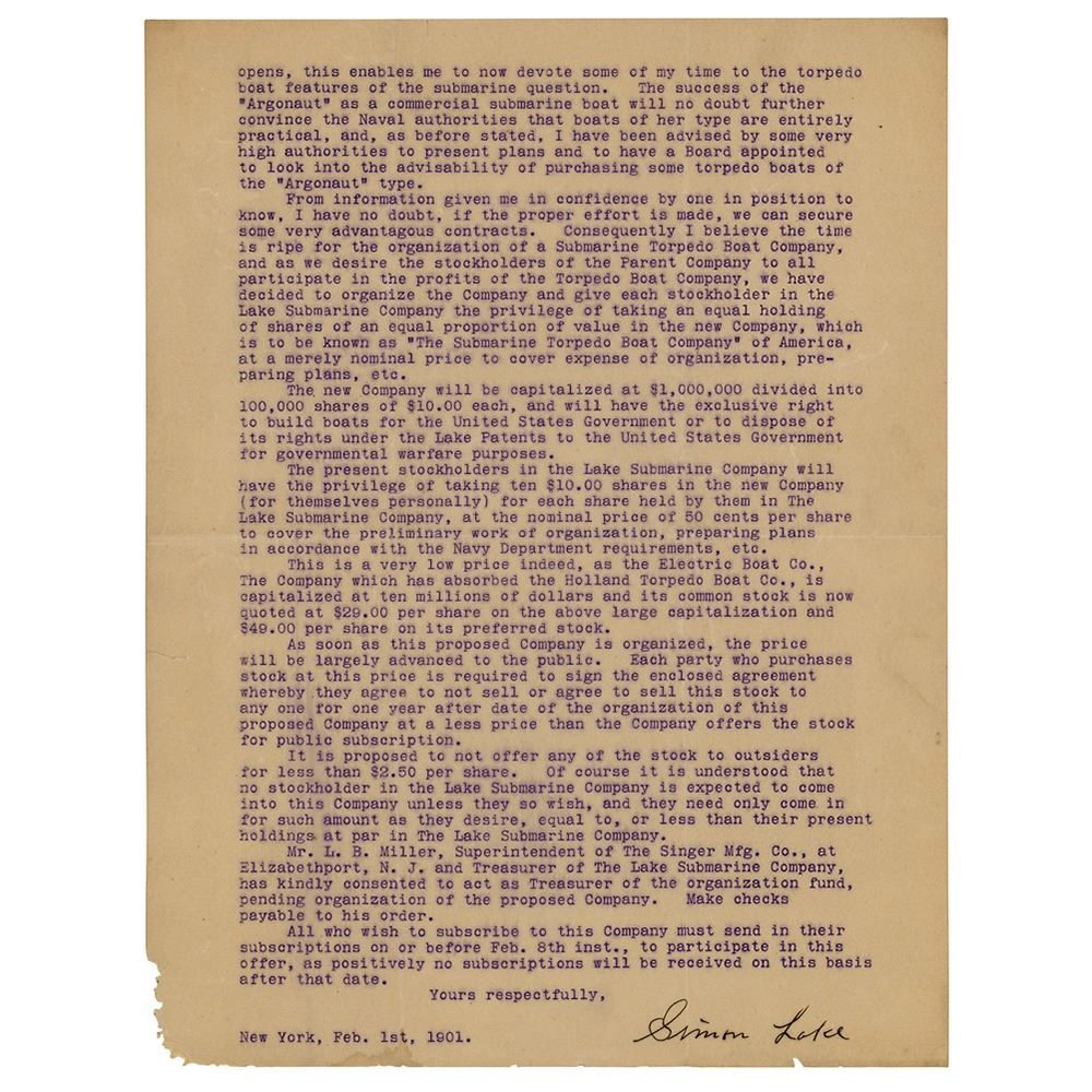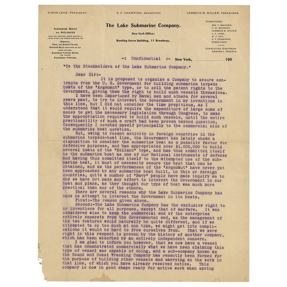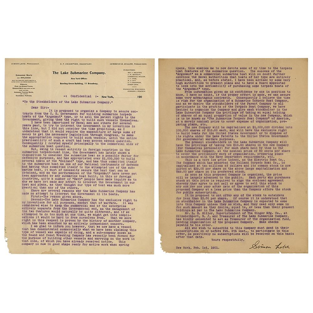 TLS, two pages, 8.5 x 11, The Lake Submarine Company letterhead, February 1, 1901. Letter marked as "Confidential," addressed to a stockholder of the Lake Submarine Company, in part: "It is proposed to organize a Company to secure contracts from the U. S. Government for building submarine torpedo boats of the 'Argonaut' type, or to sell the patent rights to the Government, giving them the right to build such vessels themselves…But, owing to recent activity in foreign countries in the submarine torpedo-boat line, the Government has lately shown a disposition to consider the submarine boat as a possible factor for defensive purposes, and has appropriated $1,000,000 to build several boats of the 'Holland' type, and had thus committed itself to the submarine boat as one of our National instruments of defense." In very good to fine condition, with light creasing and minor corner loss.