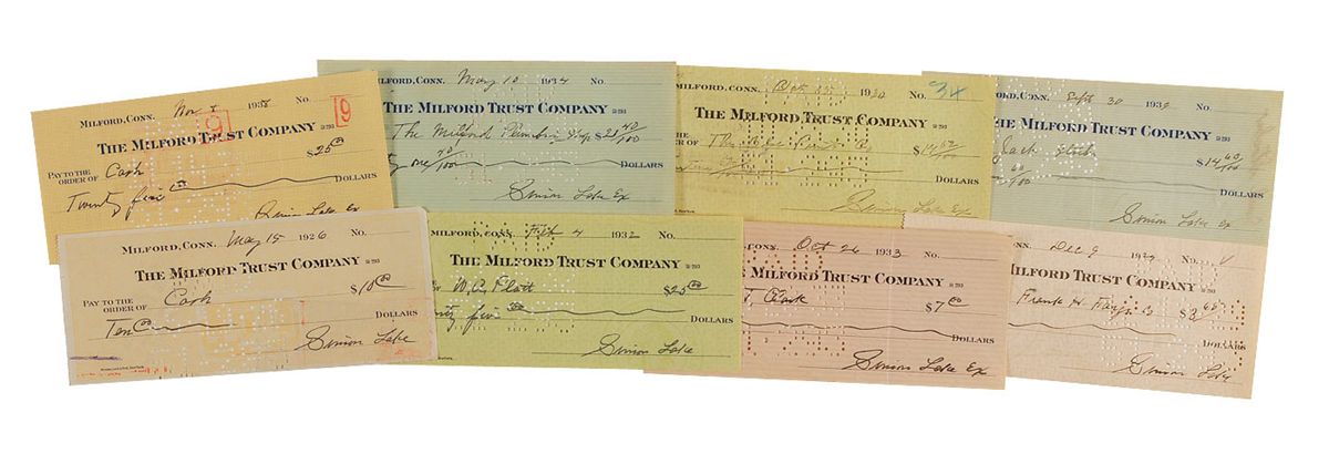 American engineer (1866–1945) who developed the first submarine to operate successfully on the open seas. Eight Milford Trust Company checks, each measuring approximately 6.25 x 2.75, all dated from 1926 through 1938, and each filled out and signed by Lake, “Simon Lake,” or “Simon Lake Ex.” Some light creasing, and the expected cancellation stamps and holes, affecting only two of the signatures, otherwise fine condition.