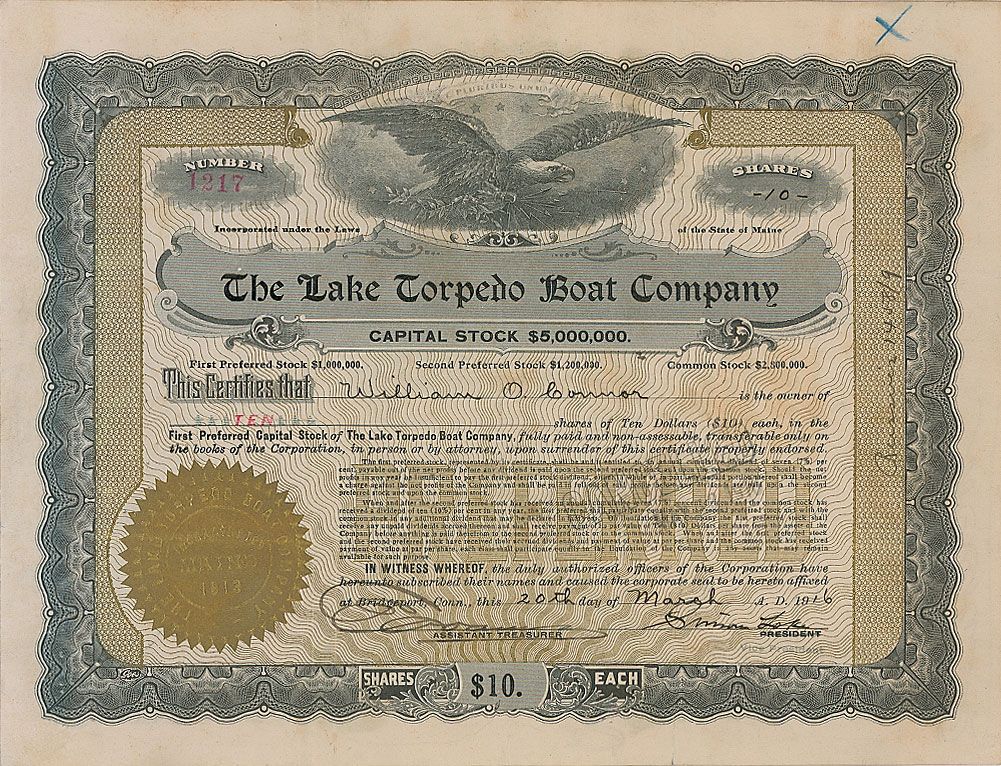 American engineer (1866–1945) who developed the first submarine to operate successfully on the open seas. DS, one page, 10.75 x 8.25, March 20, 1916. Stock certificate for ten shares of the Lake Torpedo Boat Company, signed at the conclusion by Lake. In very good condition, with intersecting folds, one vertical fold passing through a single letter of the signature, scattered creases, a few tack holes to the left side, and a pencil notation to the upper right.