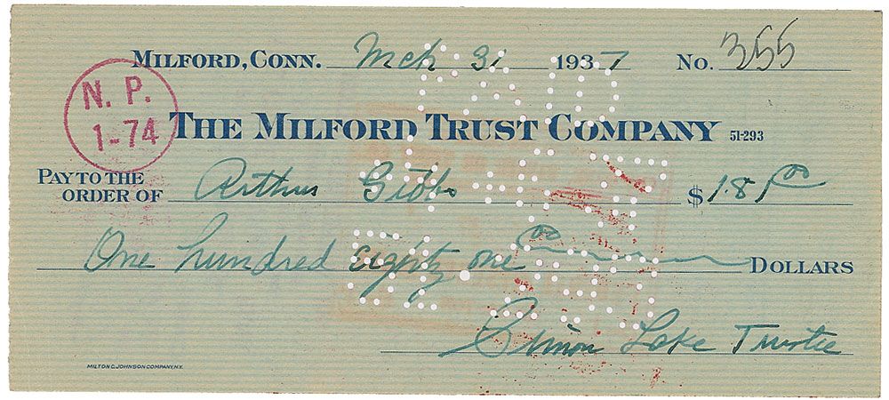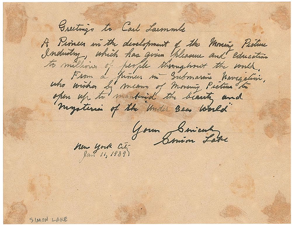 ALS, one page, 9 x 6.75, January 11, 1939. Letter to Carl Laemmle. In part: “A pioneer in the development of the moving picture industry, which has given pleasure and education to millions of people throughout the world. From a pioneer in submarine navigation, who wishes by means of moving picture to open up to mankind the beauty and mysteries of the ‘under seas world’”; and a bank check, 6 x 2.75, filled out and signed by Lake, “Simon Lake Trustee,” payable to Arthur Gibbs for $181, March 31, 1937. In very good condition, with moderate areas of show-through toning from adhesive remnants to reverse of the letter (significantly affecting overall appearance).
