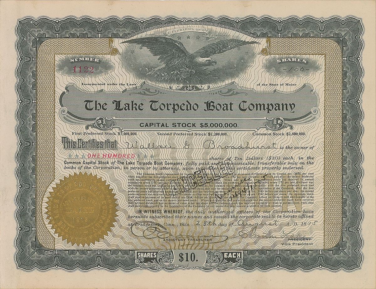 American engineer (1866–1945) who developed the first submarine to operate successfully on the open seas. Partly-printed DS, one page, 10.75 x 8.25, August 28, 1915. Certificate for one hundred shares of capital stock in The Lake Torpedo Boat Company issued to Wallace G. Broadhurst, signed at the conclusion by Lake as vice president of the company. In fine condition.
