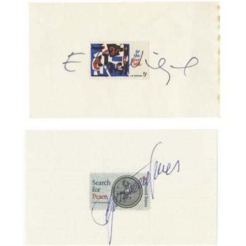 <B>Simon Wiesenthal and Elie Wiesel Signatures</B></I> "<I>Simon Wiesenthal</B></I>" and "<I>Elie Wiesel</B></I>". Each signature appears on a 5" x 3" card, each signed in ink over appropriate United States postage stamps, both signatures in fine condition.<BR><BR><b>Shipping:</b> Flat Material, Small (<a target="_blank" href="http://www.heritageauctions.com/common/shipping.php">view shipping information</a>)