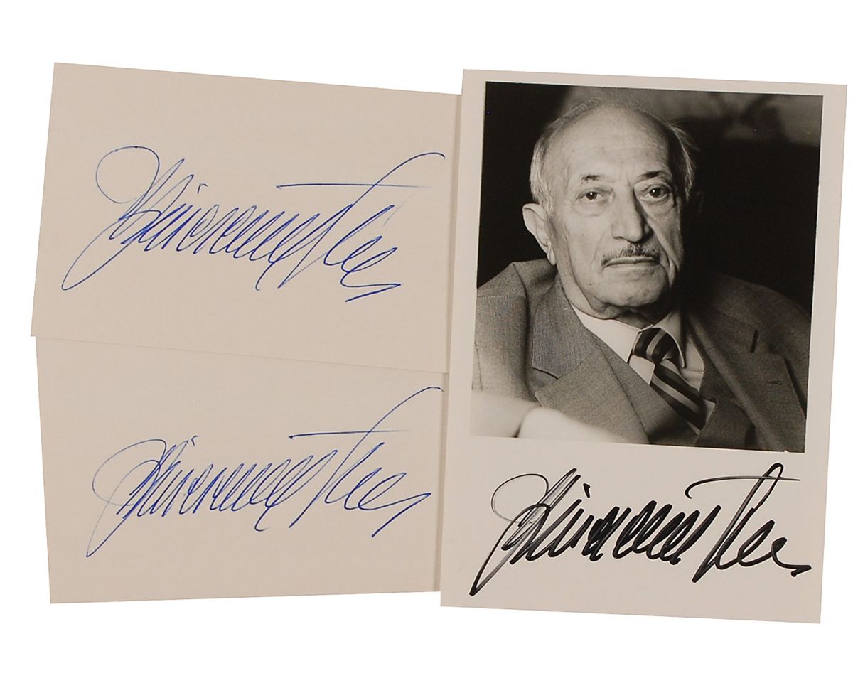 Three items: one glossy 4 x 6 photo, signed in the lower border in black felt tip; and two blue ballpoint signatures on individual off-white 5 x 3 cards. In overall very fine condition. Accompanied by the original printed transmittal slip.