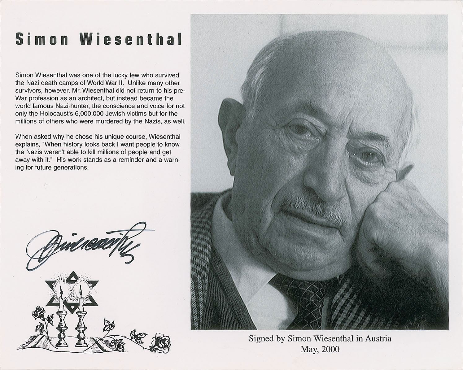 Holocaust survivor, Nazi hunter, and writer (1908–2005). Cardstock 10 x 8 photo featuring an image and description of Wiesenthal, signed in black felt tip. In fine condition.
