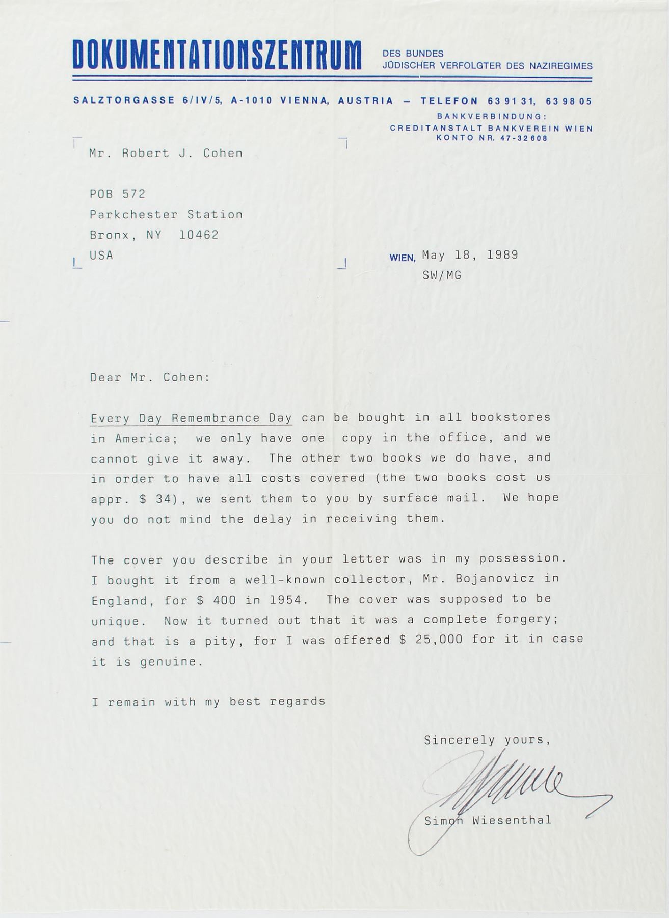 TLS, one page, 8.25 x 11.25, Dokumentationszentrum letterhead, May 18, 1989. Letter to Robert J. Cohen, in part: "Every Day Remembrance Day can be bought in all bookstores in America; we only have one copy in the office, and we cannot give it away…The cover you describe in your letter was in my possession. I bought it from a well-known collector, Mr. Bojanovicz in England, for $400 in 1954. The cover was supposed to be unique. Now it turned out that it was a complete forgery; and that is a pity, for I was offered $25,000 for it in case that it is genuine." In fine condition.