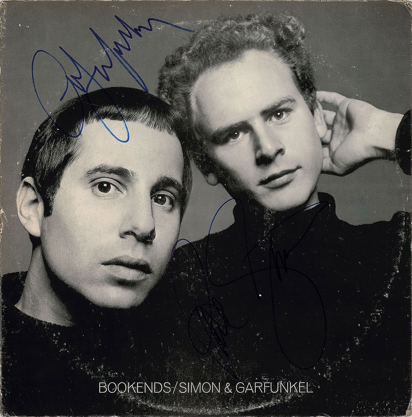 Bookends album signed on the front cover in blue felt tip by Paul Simon and Art Garfunkel. In very good to fine condition, with light scuffing and edge wear. The record is included.