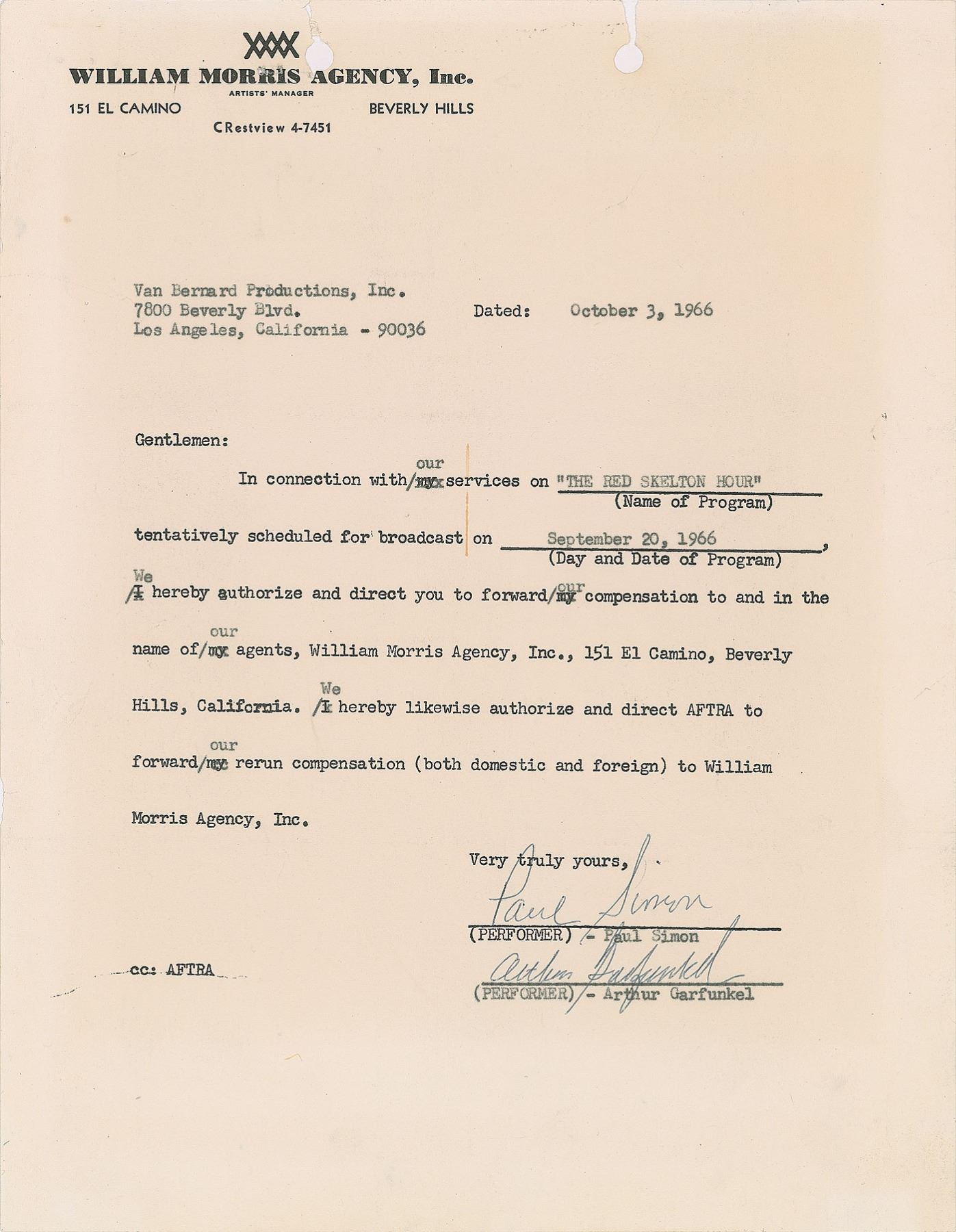 DS, signed “Paul Simon" and "Arthur Garfunkel,” one page, 8.5 x 11, October 3, 1966. Letter addressed to Van Bernard Productions, in which Simon and Garfunkel authorize and direct said company to forward compensation to the William Morris Agency for their "services on 'The Red Skelton Hour,'" which aired on September 20, 1966. Signed at the conclusion in black ballpoint by Simon and Garfunkel. In fine condition, with scattered light creasing and faint overall toning. Simon and Garfunkel made their television debut on September 20, 1966, when they appeared on an episode of the long-running NBC variety program The Red Skelton Show. The episode featured Mickey Rooney as the special guest, and Simon and Garfunkel performed 'I Am A Rock' from their Sounds of Silence album, and 'The Dangling Conversation' from their forthcoming Parsley, Sage, Rosemary and Thyme. A fantastic document precisely dating to the duo's mainstream breakthrough.
