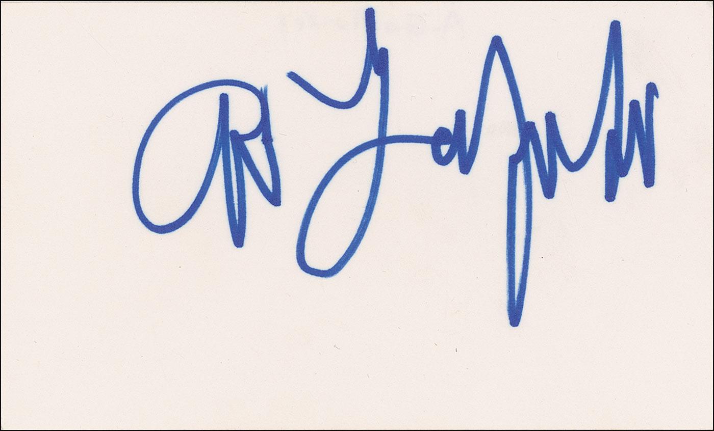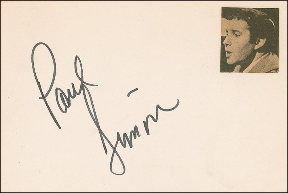 Felt tip signature, “Paul Simon,” on an off-white 6 x 4 card, with a clipped photo affixed to top right corner; and a felt tip signature “Art Garfunkel,” on an off-white 5 x 3 card. In fine condition.
