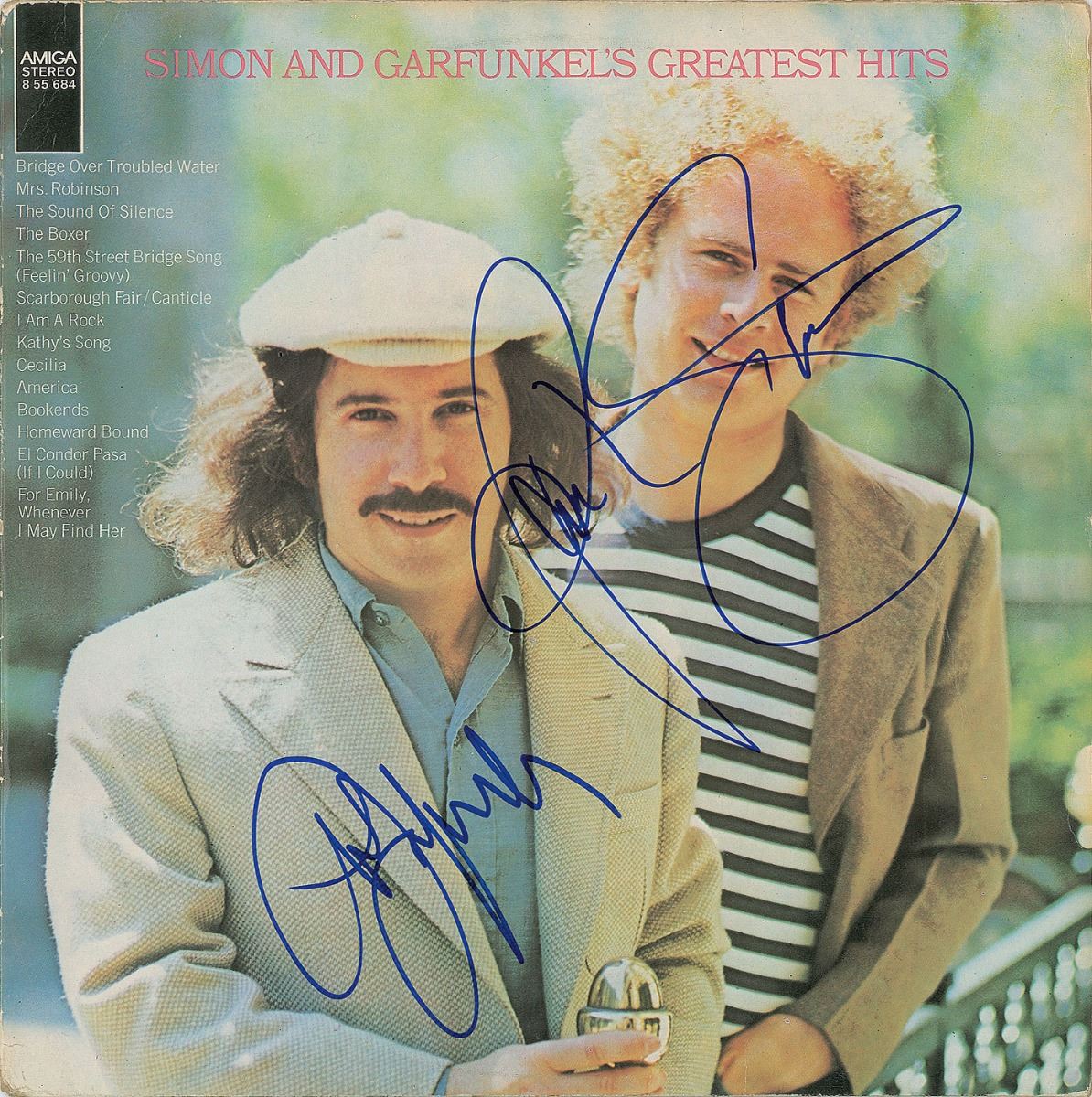 Simon and Garfunkel's Greatest Hits album signed on the front cover in blue felt tip by Paul Simon and Art Garfunkel. In fine condition, with scattered creasing. The record is not included.
