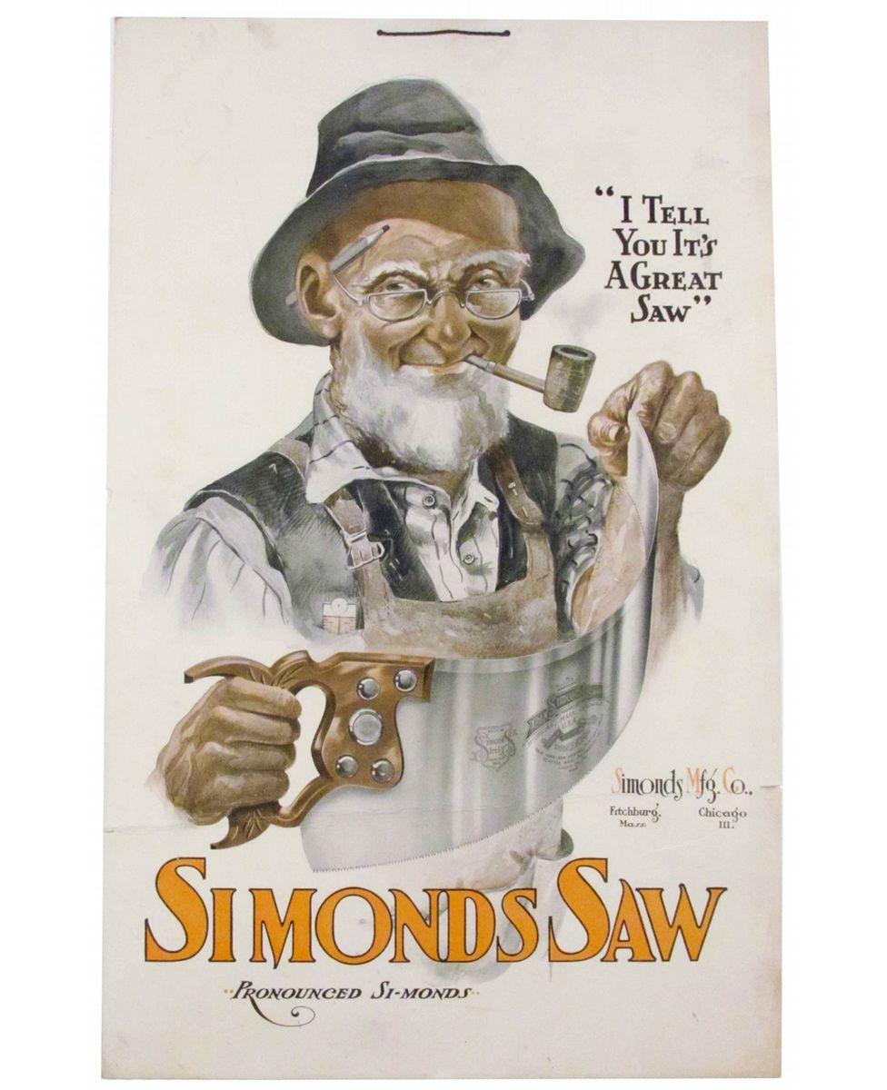 Simonds Saw Cardboard string hanger Sign. Depicting Grandpa exhibiting the flexibility of the blade. Very good condition. Approx. 12 X 16 inches.