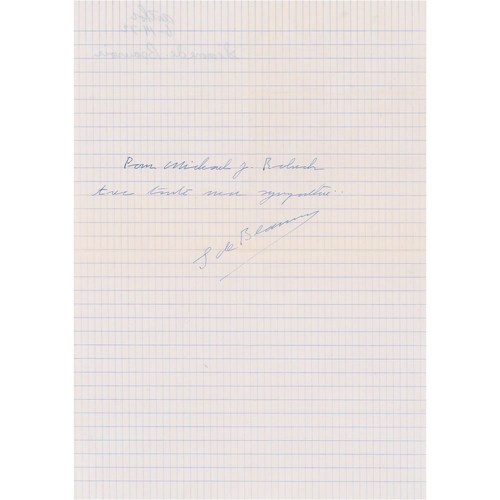 French existentialist, writer, and social essayist (1908–1986). Ink signature and inscription, "Pour Michael J. Robuck, Avec toute ma sympathie, S. de Beauvoir,” on an off-white 8.25 x 11.5 sheet. In fine condition, with intersecting folds. Accompanied by the original mailing envelope, postmarked in 1972.