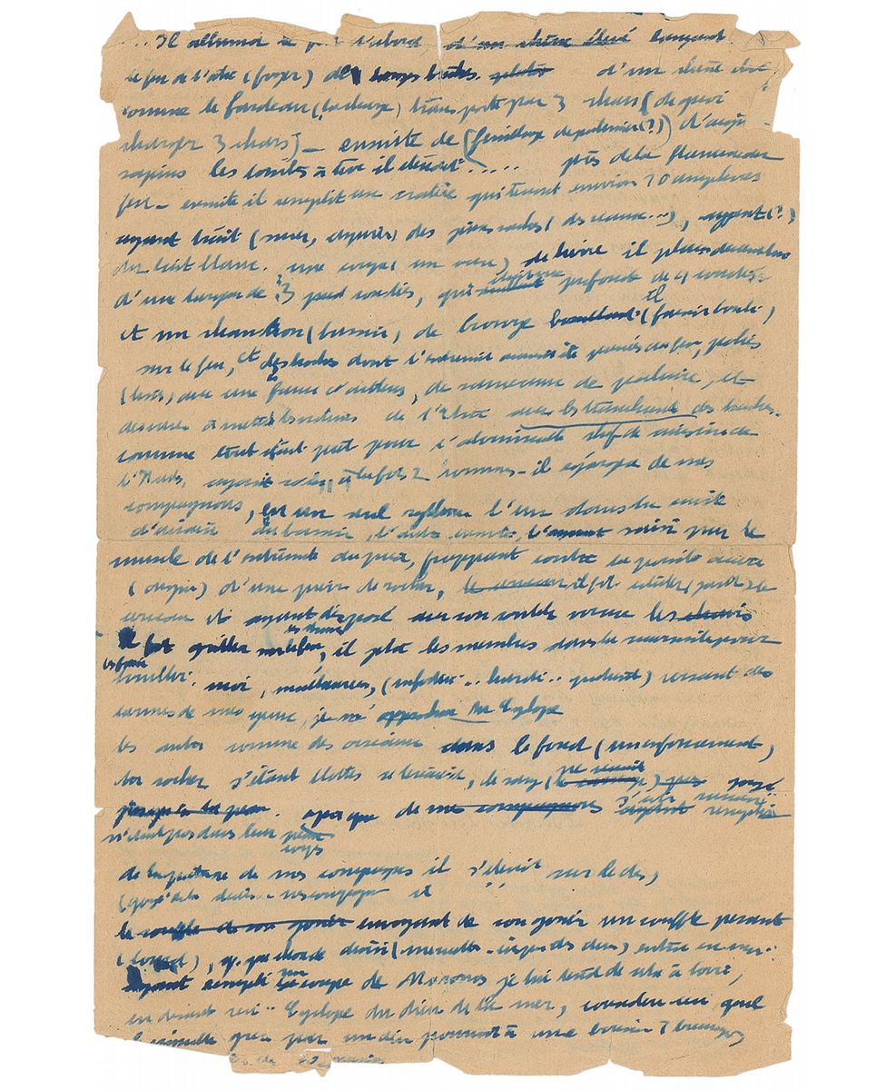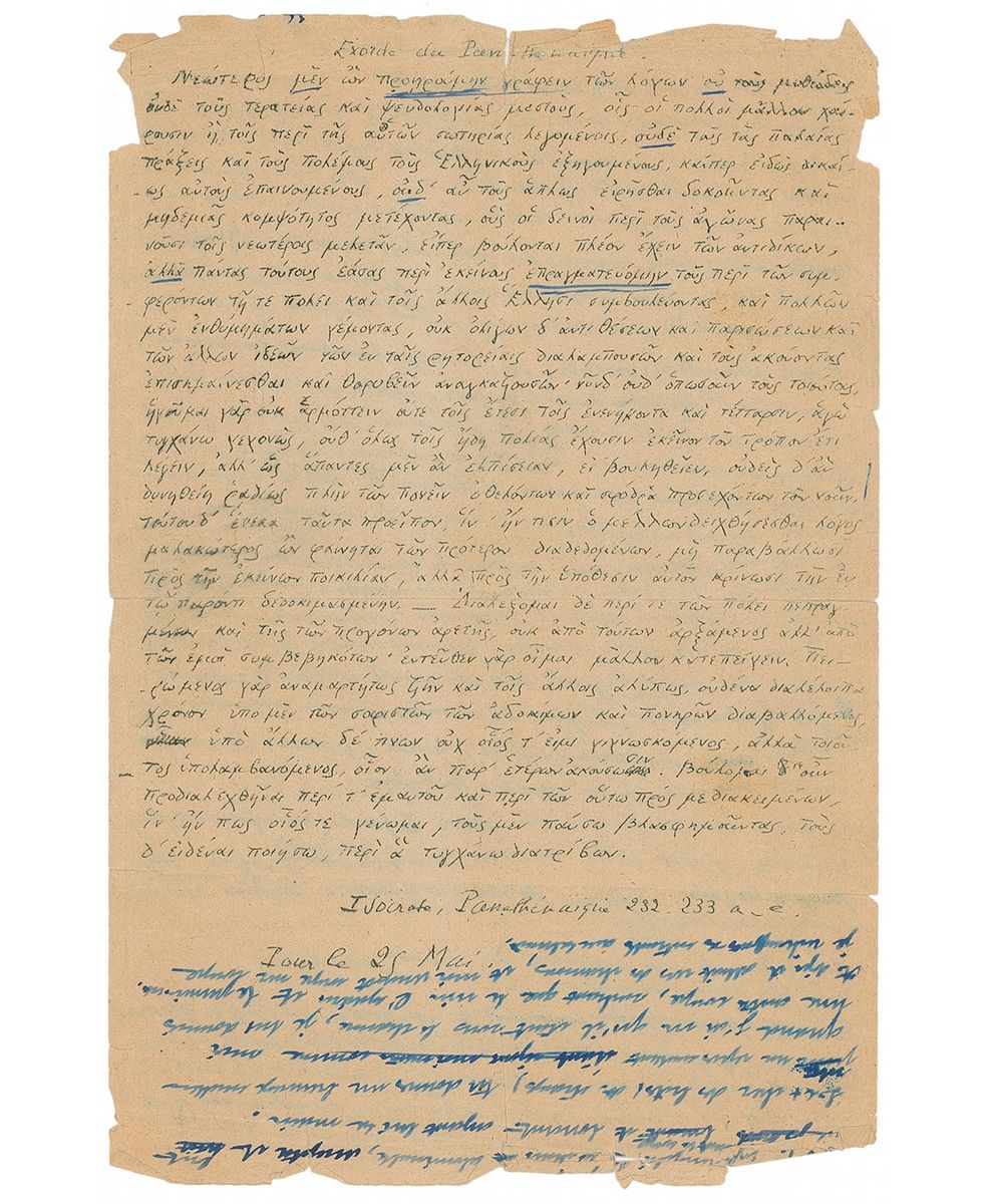 Untranslated handwritten manuscript in French, unsigned, one page both sides, 8.75 x 13, no date. A handwritten essay in blue ink, penned by de Beauvoir below and on the reverse of a facsimile copy of Isocrate’s ‘Panathenaic’ in Greek. Partial separations to intersecting folds, overall toning, and tears and creases to edges affecting a few lines of writing, otherwise very good condition. In ‘Panathenaicus,’ Isocrates examines the literacy of the Spartans, suggesting that some members of the society were literate but needed an interpreter to understand subtext or concealed meanings. De Beauvoir address this subject in some of her work, including The Second Sex and her autobiography, examining the role that literacy plays in the construction of class and social hierarchies. An interesting academic piece from the important intellectual.