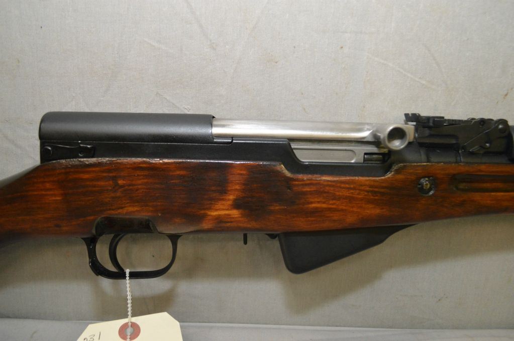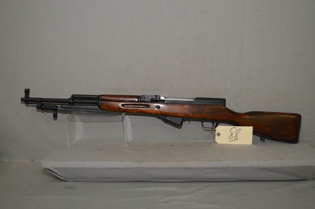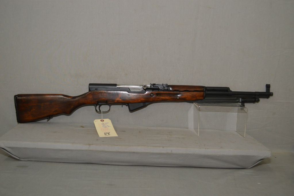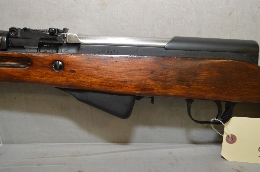 Simonov Model SKS Dated 1952 7.62 x 39 Russian Cal Semi Auto Full Wood Military Rifle w/ 20" bbl [ flat blued finish, barrel sights, revarnished wood, attached folding bayonet, cleaning rod, added rubber butt plate, sling swivels ] Ser # NM 4436