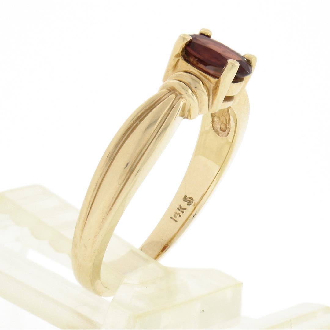A solid 14k yellow gold solitaire ring, with 1 oval cut natural garnet (4x6mm). The ring is size 6.0, weighs a total of 2.88 grams, and measures 6mm wide.