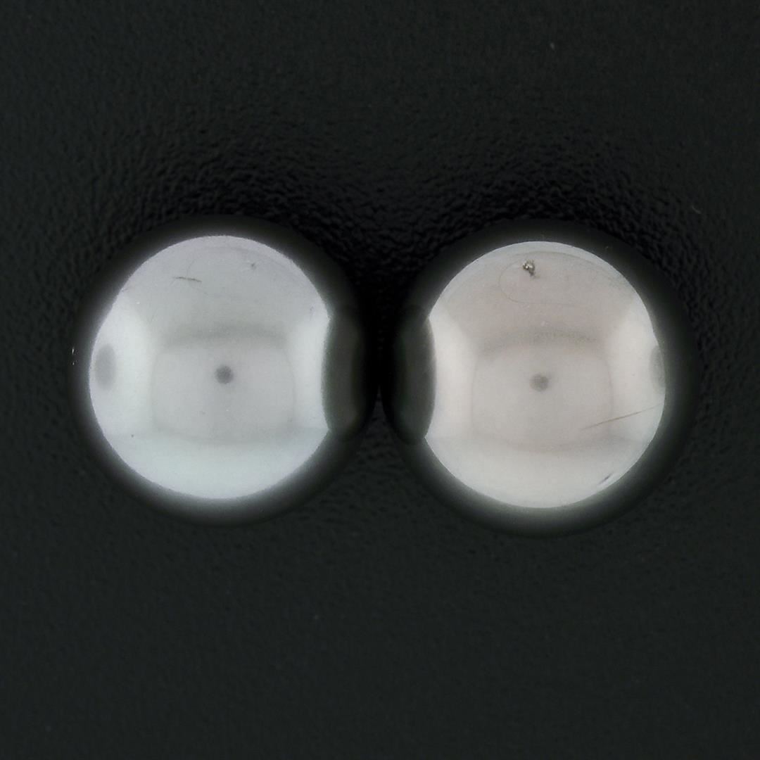 A solid 18k yellow gold stud earrings, with 2 round shape natural tahitian pearls (10.75mm and 10.90mm). The earrings measure approximately 10.75mm to 10.90mm in diameter and weigh a total of 4.51 grams.